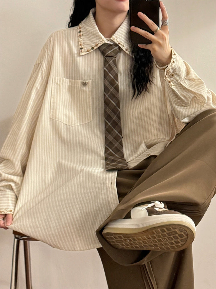 A long-sleeve striped shirt with a relaxed cut and subtle decorative details.
