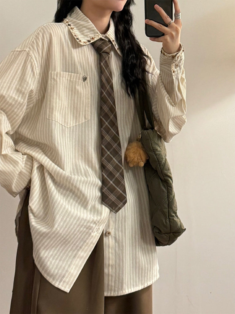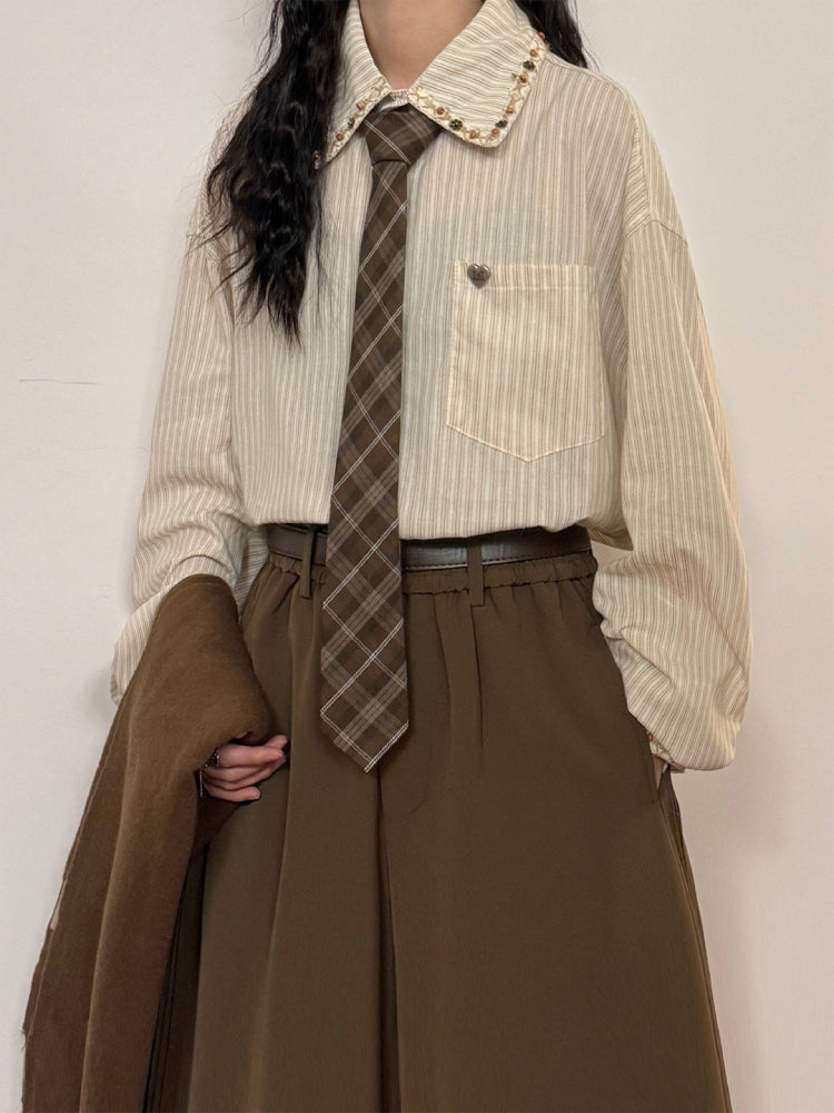 Soft vertical stripes, a quiet tie at the collar, and bead details that catch light like footsteps in a library corridor 🍂