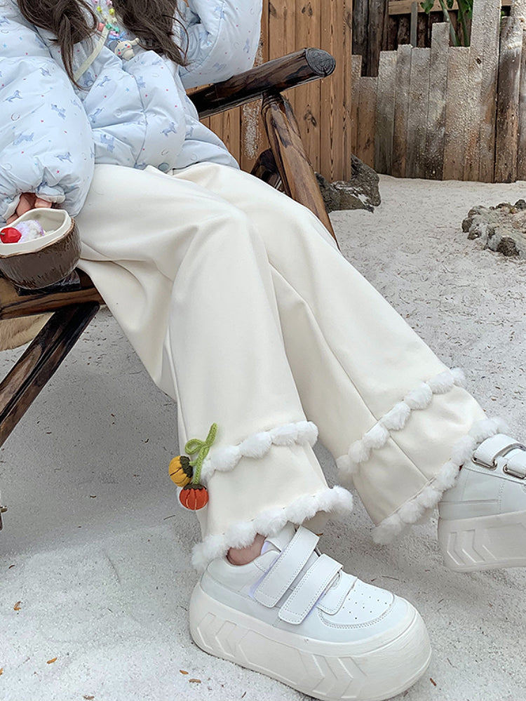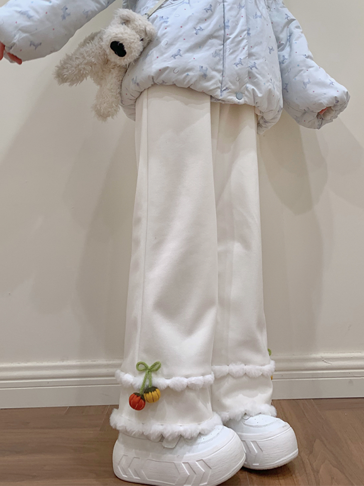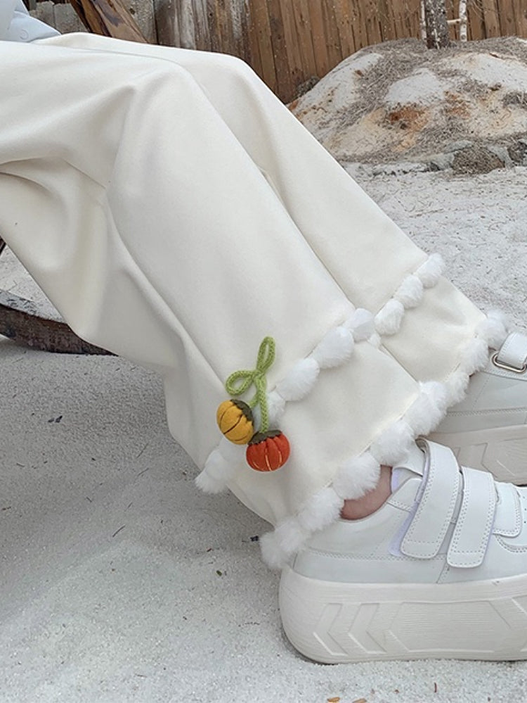 High-waisted straight-leg winter trousers with soft pompom trim and small pumpkin accents.