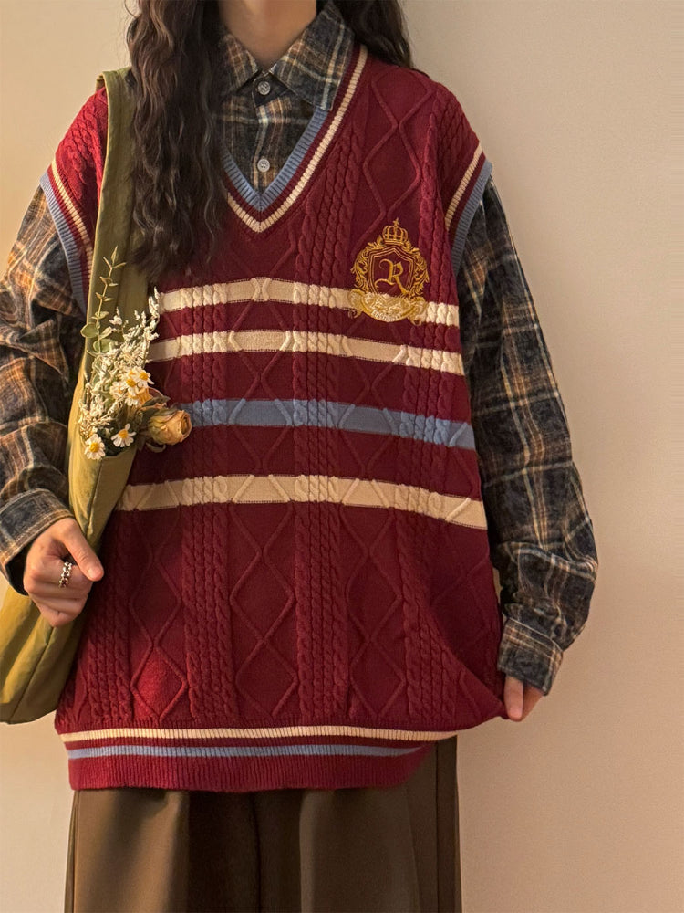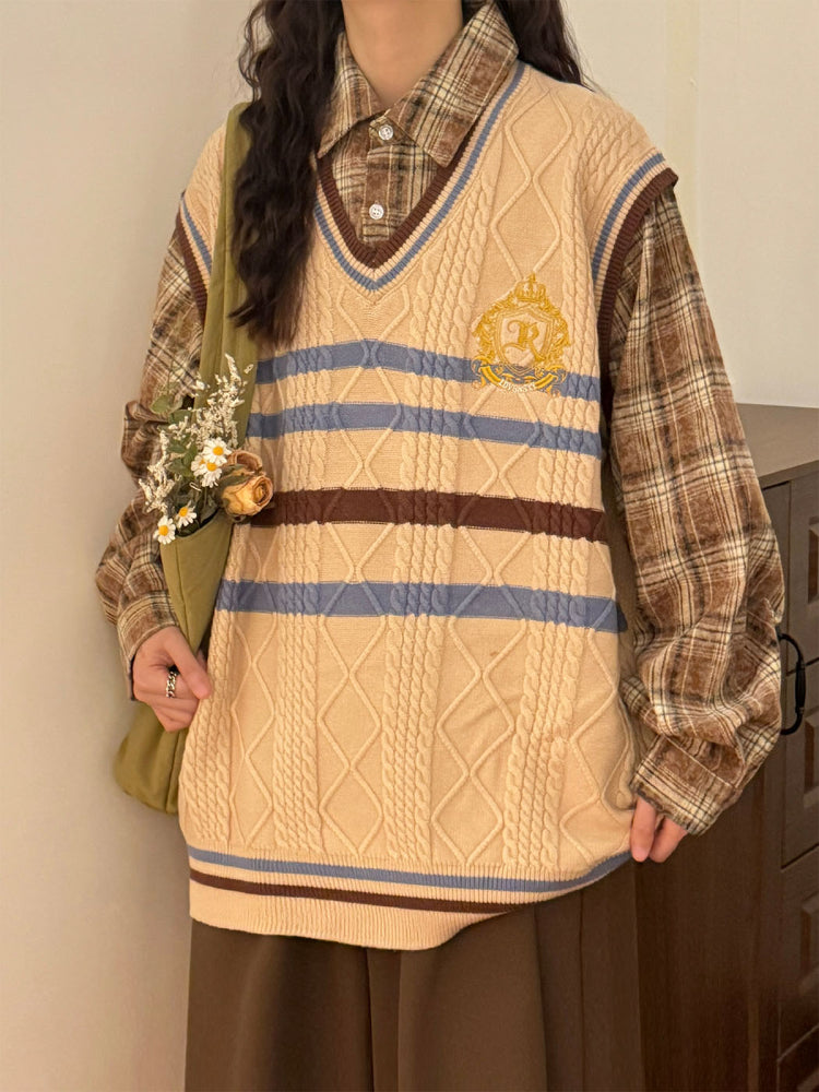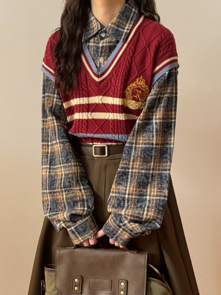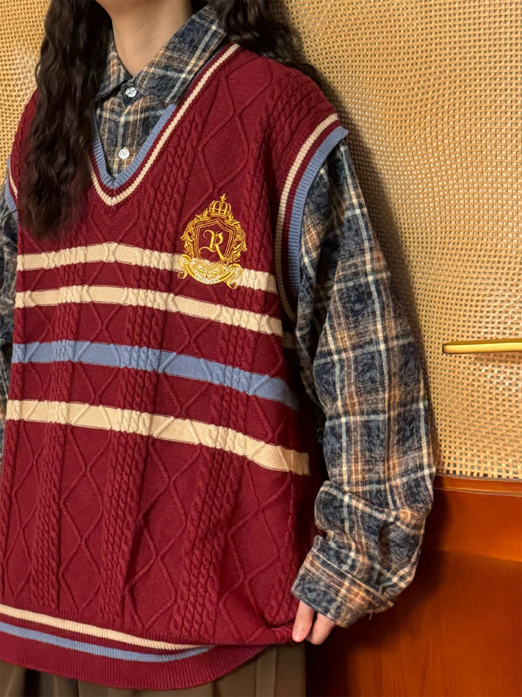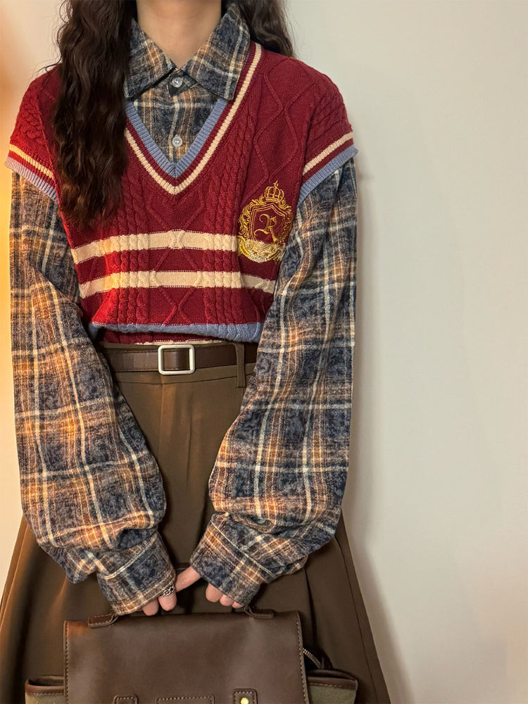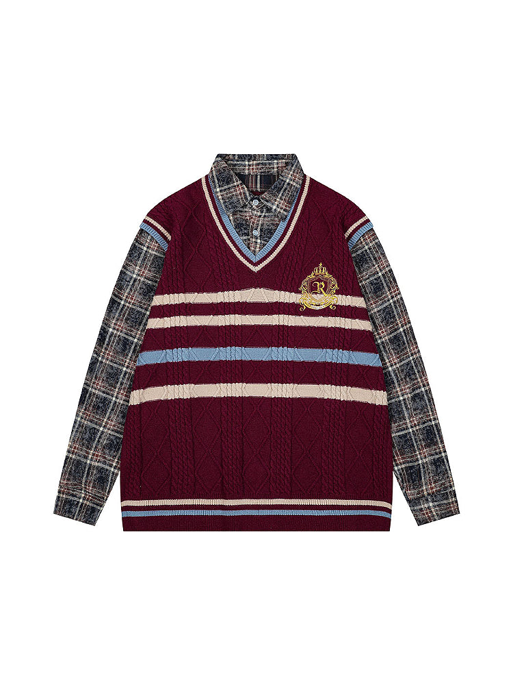 - Design: Fake two-piece patchwork sleeve shirt + cable knit vest with crest embroidery
