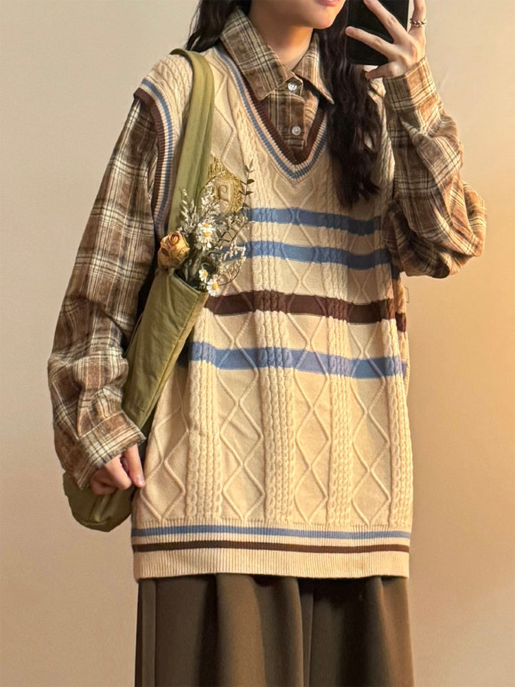 A vintage preppy knit vest fused with a plaid shirt sleeve design — giving you the layered academia look instantly. Cozy, collegiate, and full of winter charm.