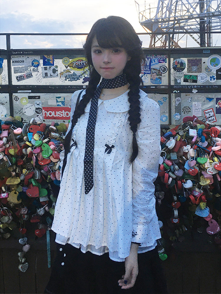 • Styling Tip: Pair with a midi skirt or wide trousers and a ribbon choker for instant “retro study girl” charm