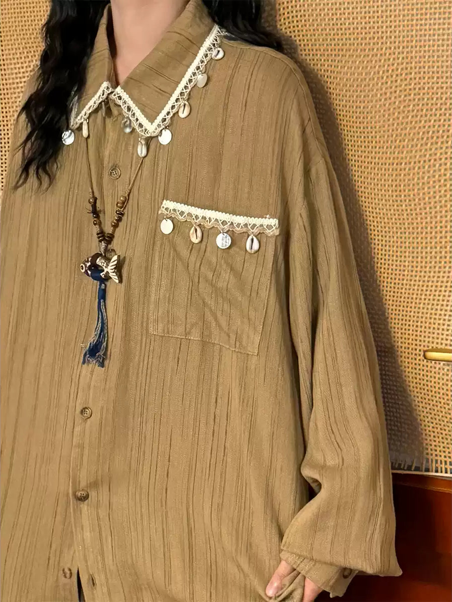 A loose long sleeve shirt with vertical stripes and patchwork trim details.