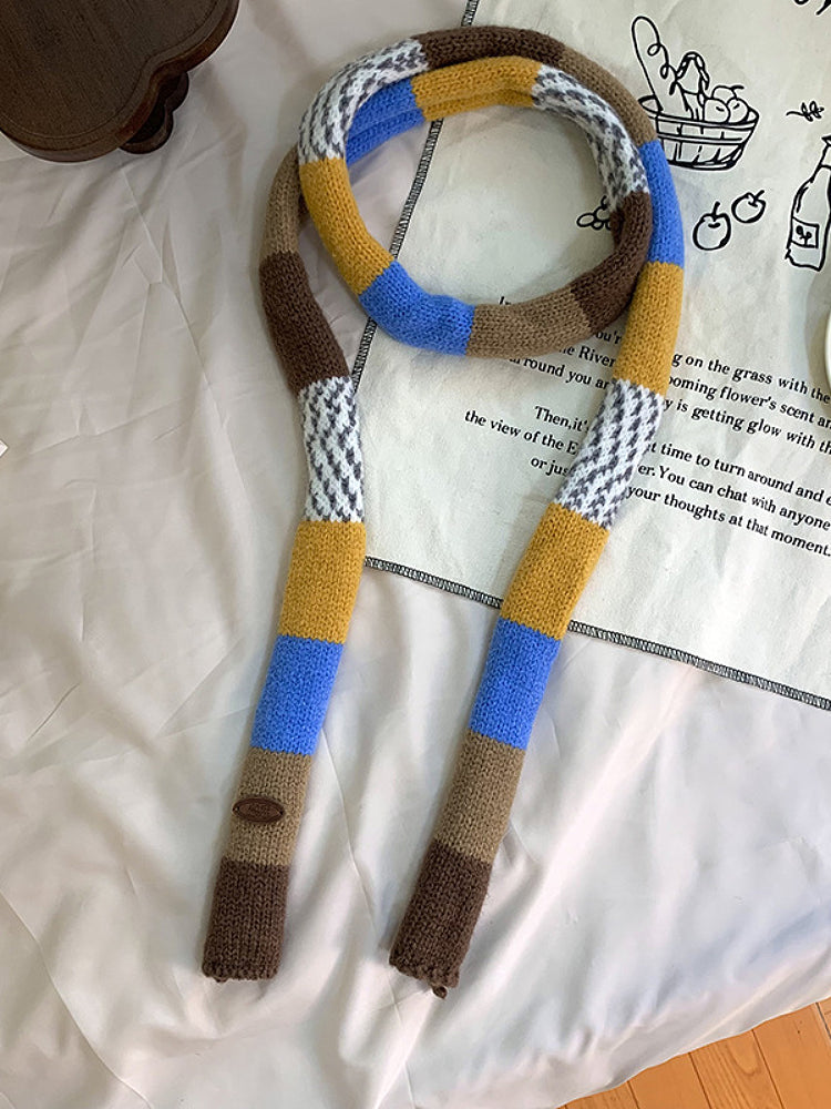A slim, color-blocked scarf inspired by cozy library hours and indie color palettes. Lightweight but full of charm — your go-to accent for artful layering.