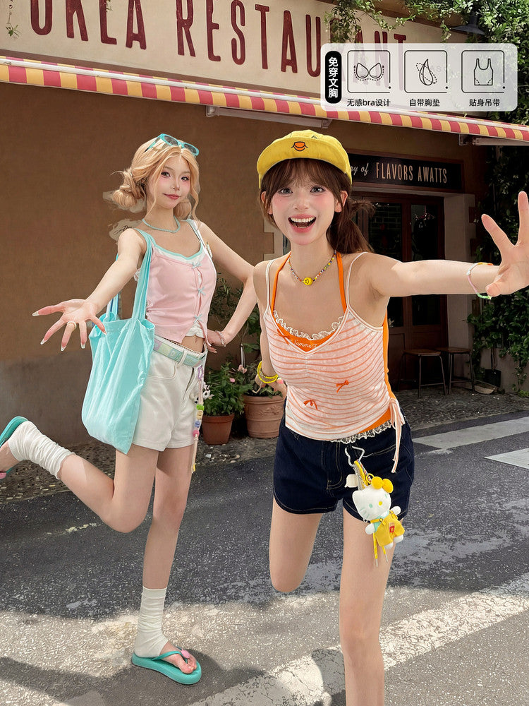 A playful contrast-trim camisole designed with a layered fake two-piece look and delicate ribbon accents, bringing a fresh pastel dopamine mood to summer styling.