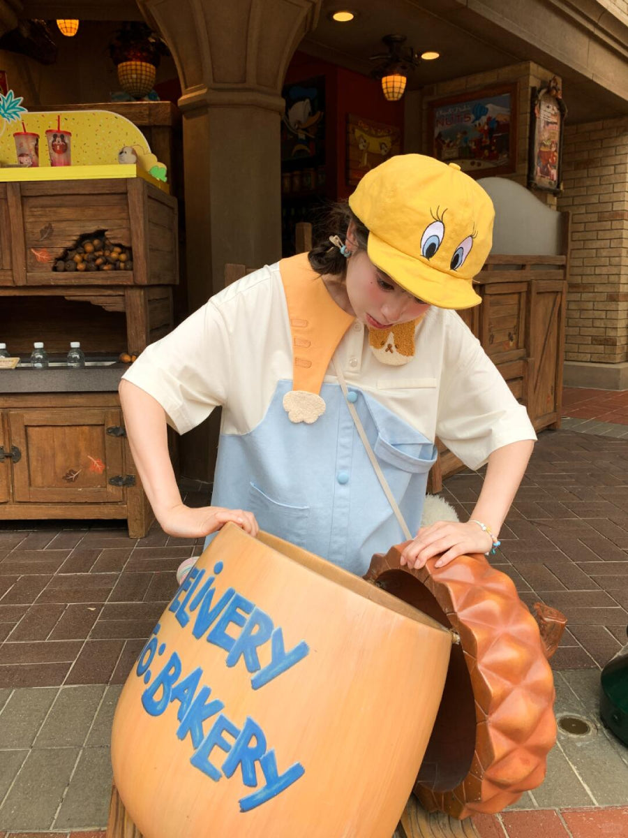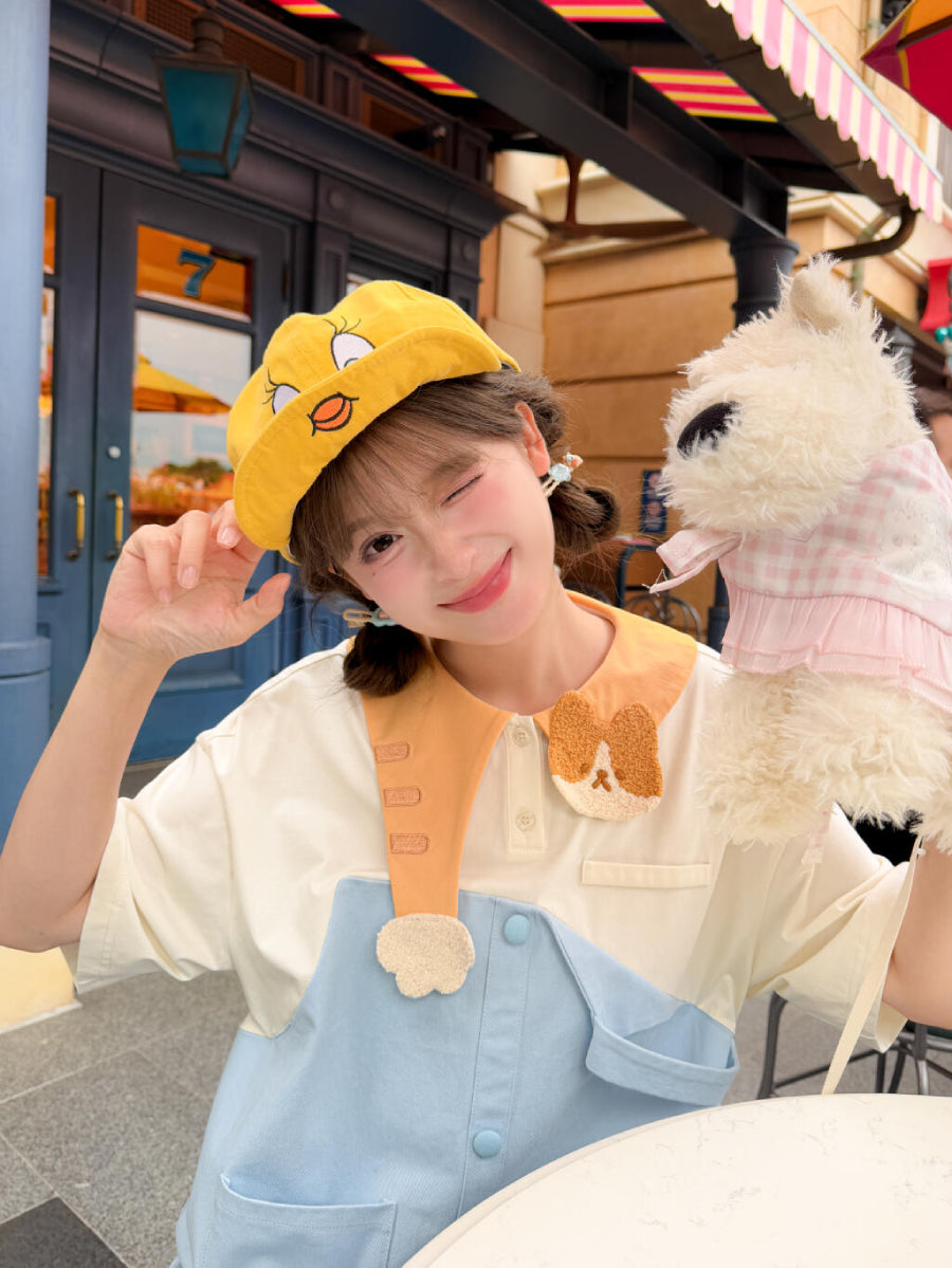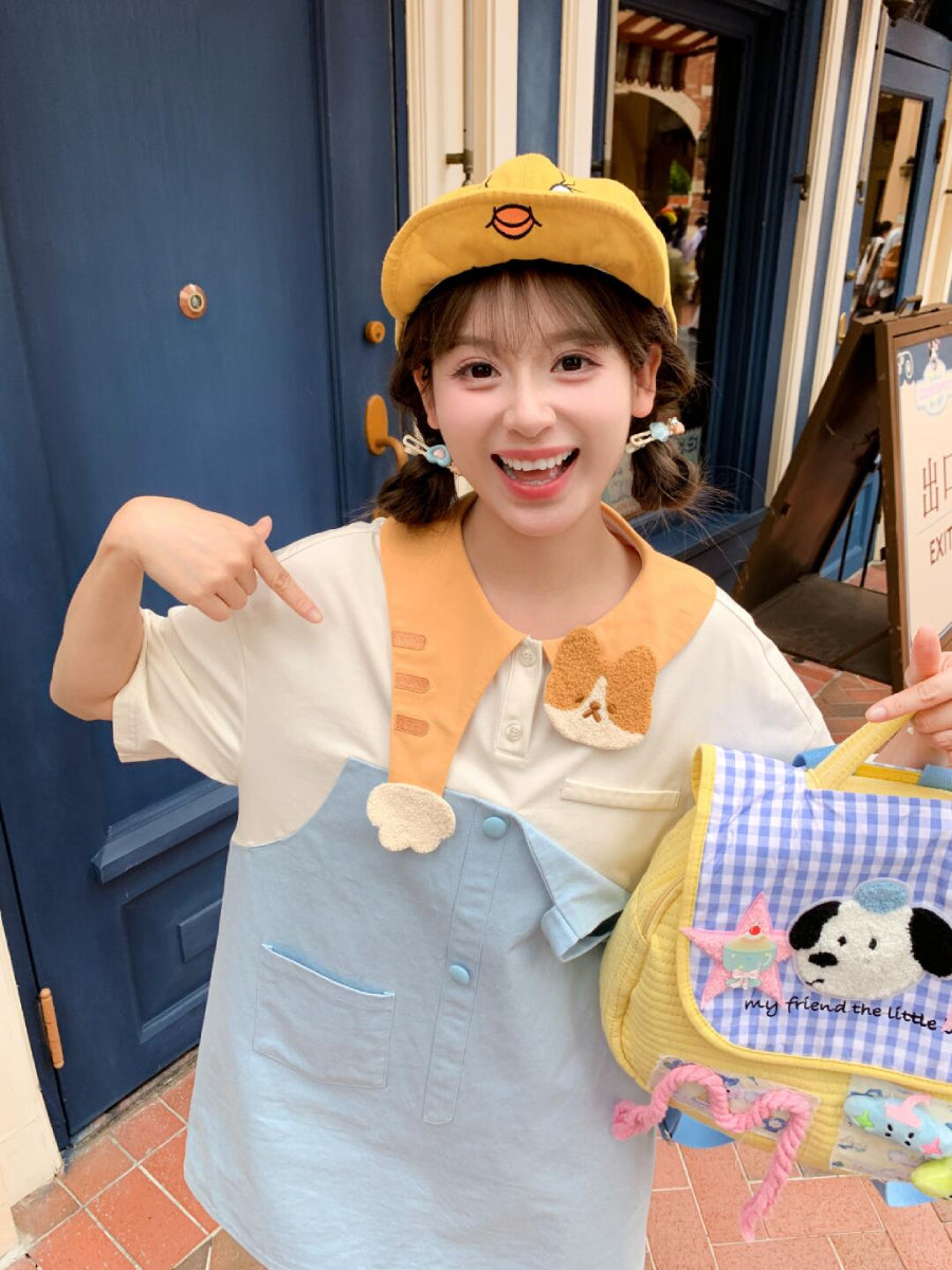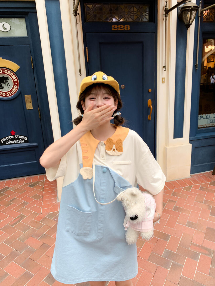 Blue panels, a kitten collar, cotton buttons — the sort of dress worn while coloring at a low table 🐱