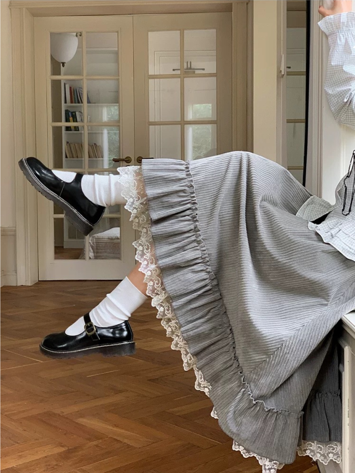 A soft collegiate-style A-line skirt with a ruffled lace hem — gentle winter texture, classic school-girl charm, and sweet vintage layering for calm autumn–winter outfits.