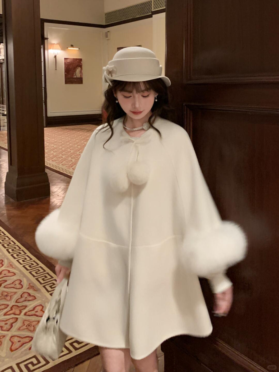 A cape-style wool coat designed to move easily while keeping a clear silhouette.