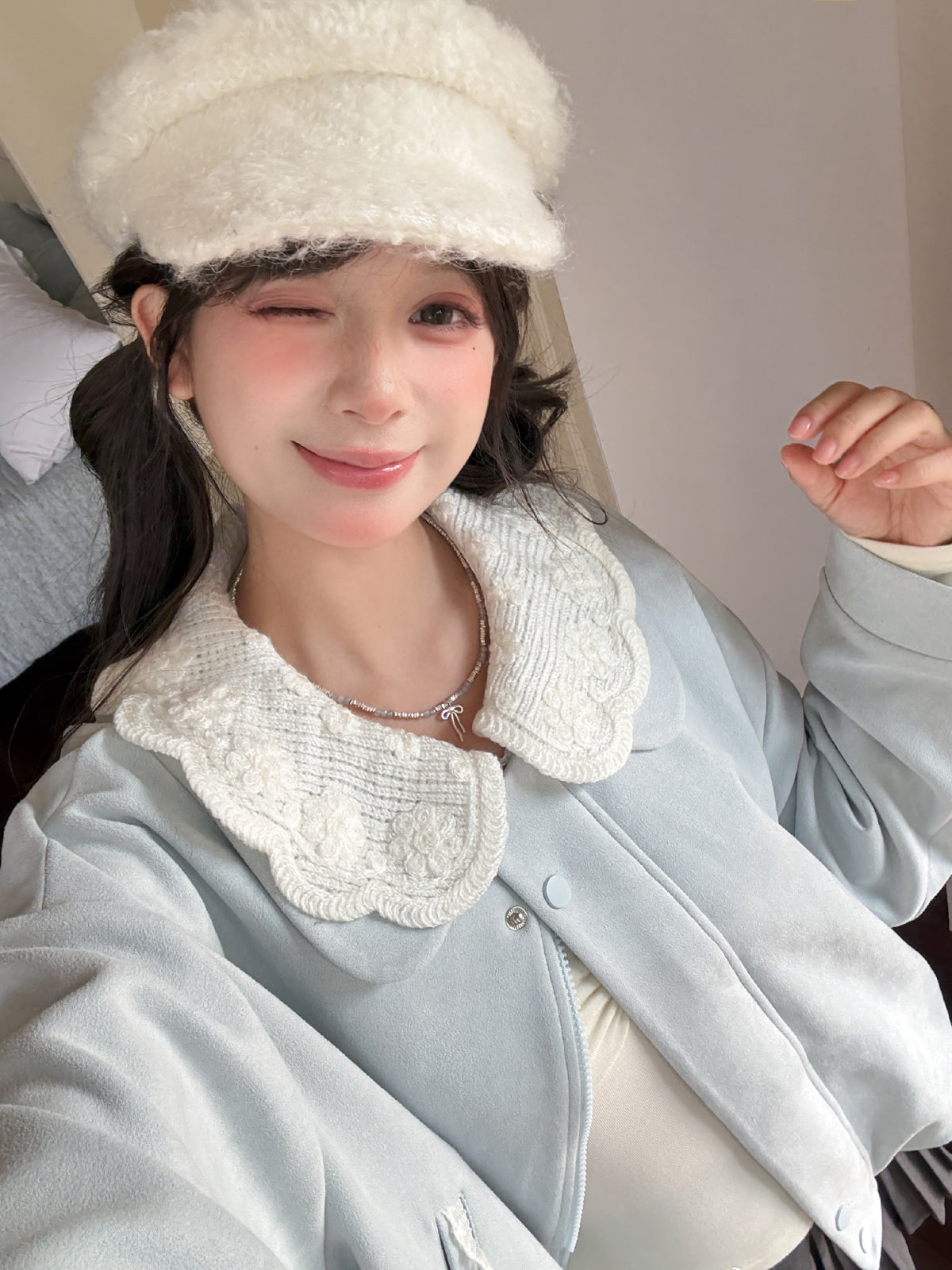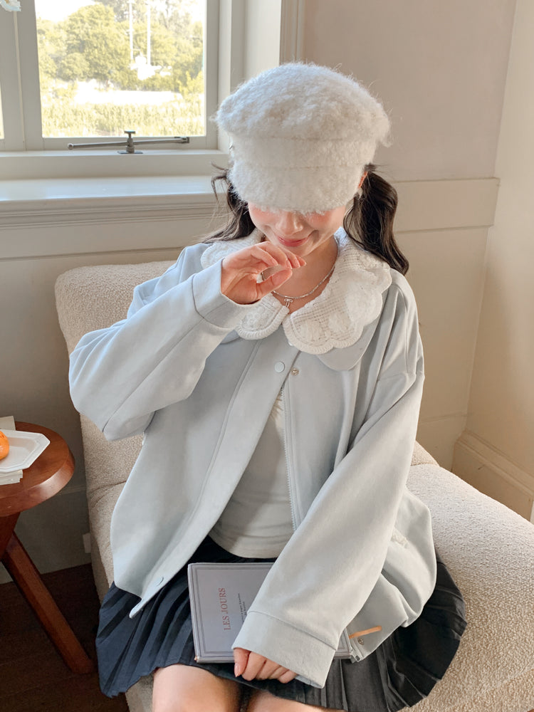 Pale suede fabric, lace collar, loose sleeves — a moment paused on a wooden staircase before going back down 🌿