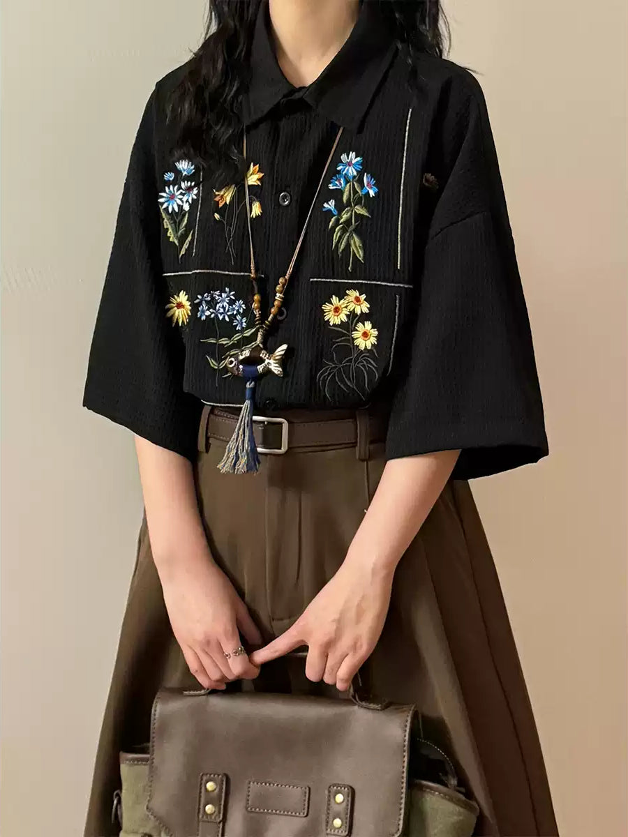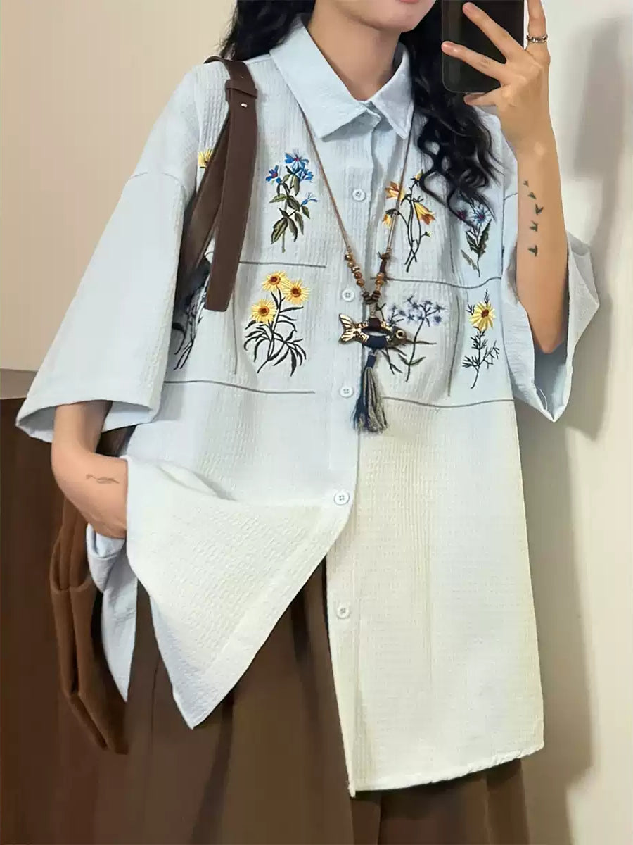 A loose short-sleeve shirt with floral embroidery set across a textured surface.