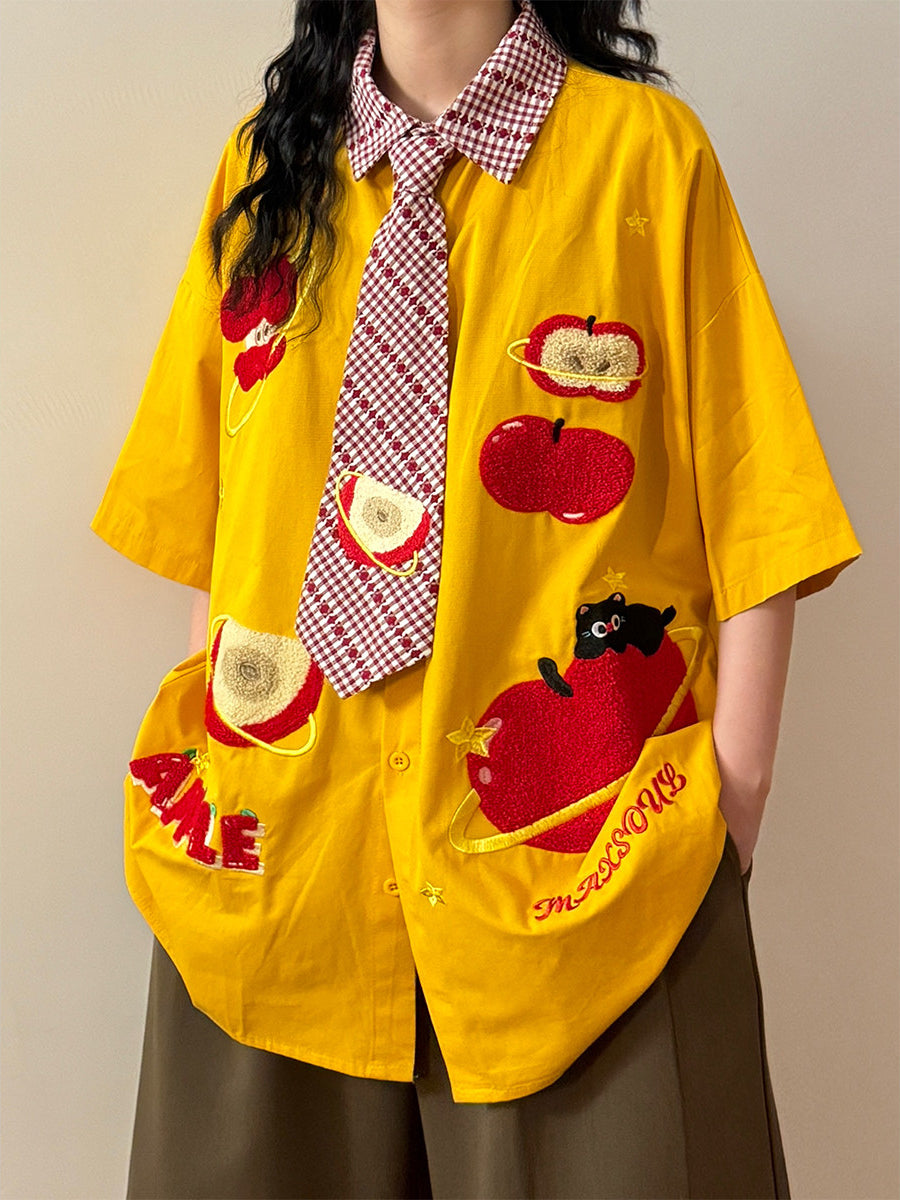 A short-sleeve shirt built around contrast color blocks and embroidered apple details.