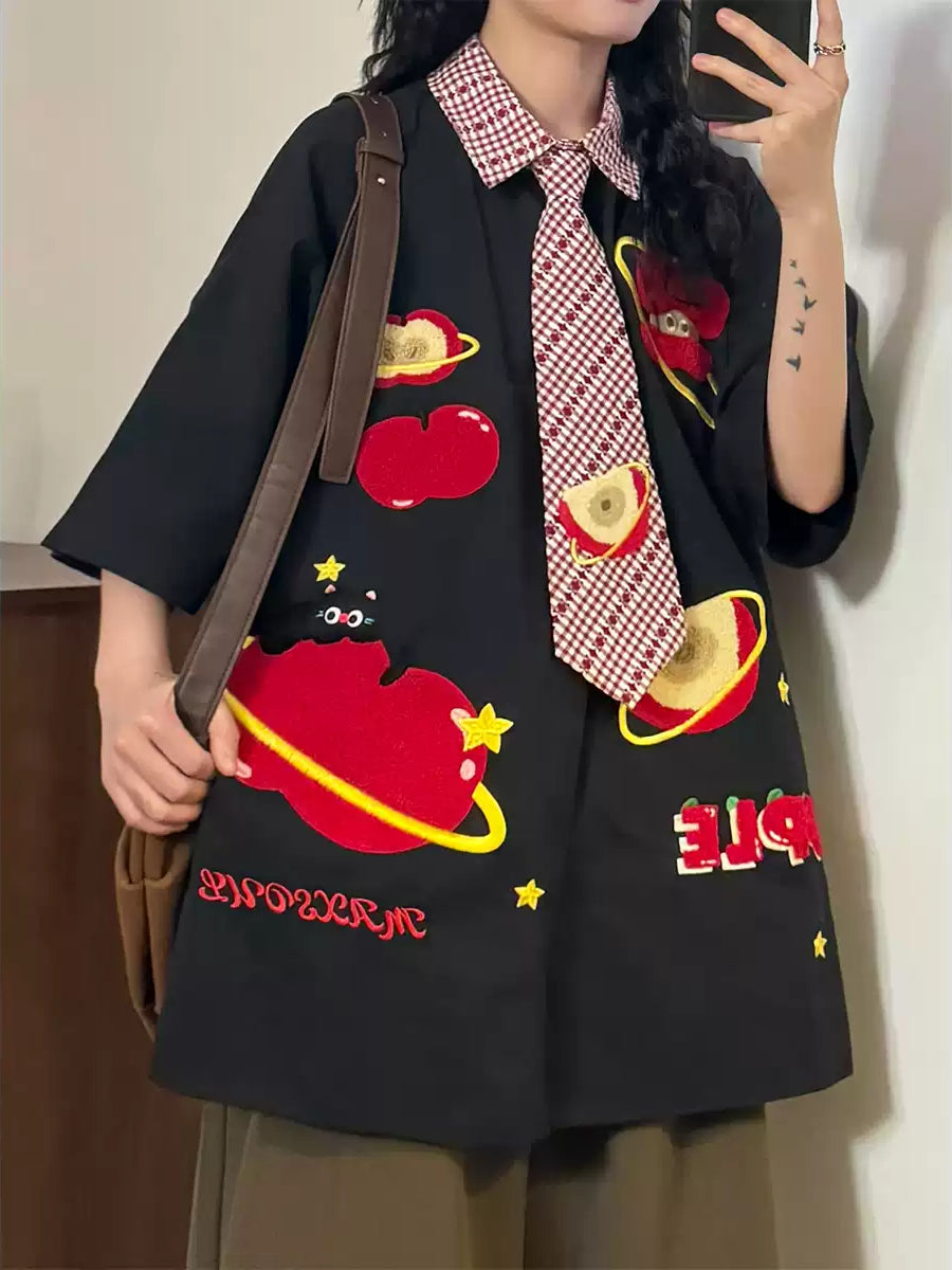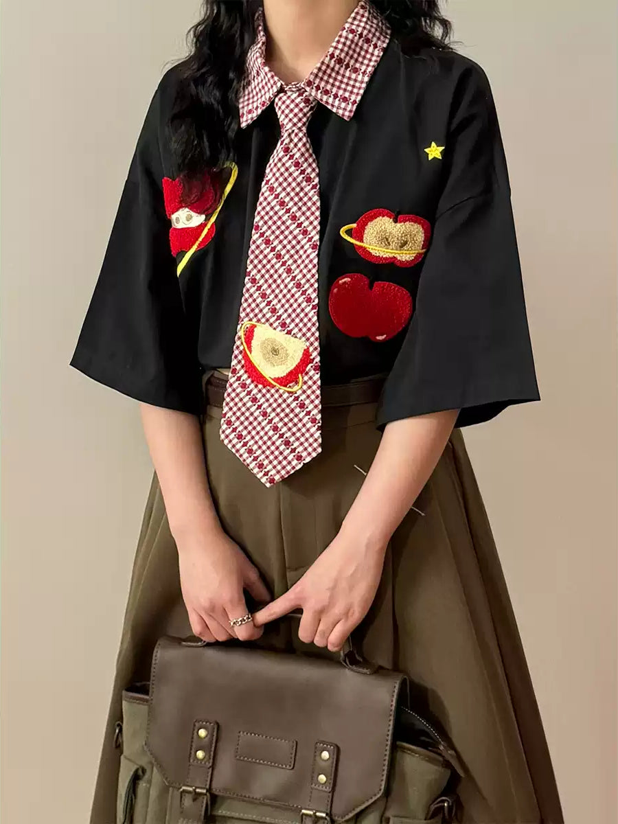 Red stitching on apple shapes, a checked tie at the collar — the kind of shirt spotted near a school gate at dusk 🍎