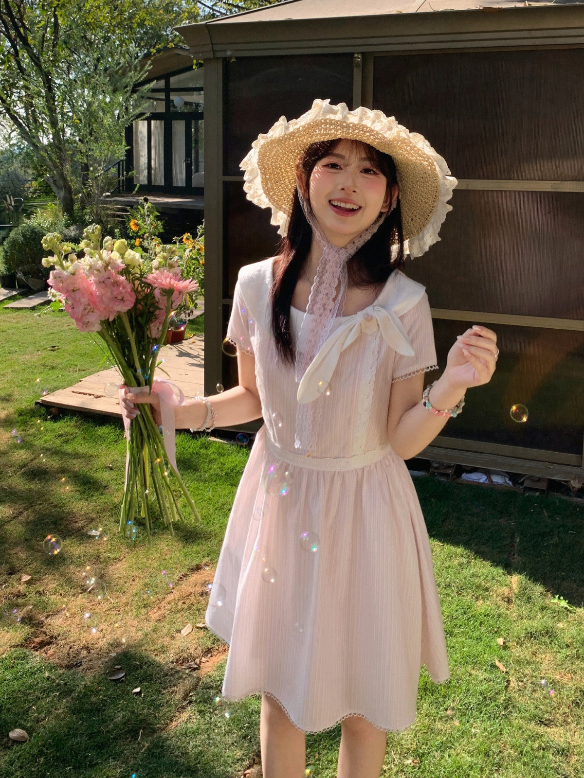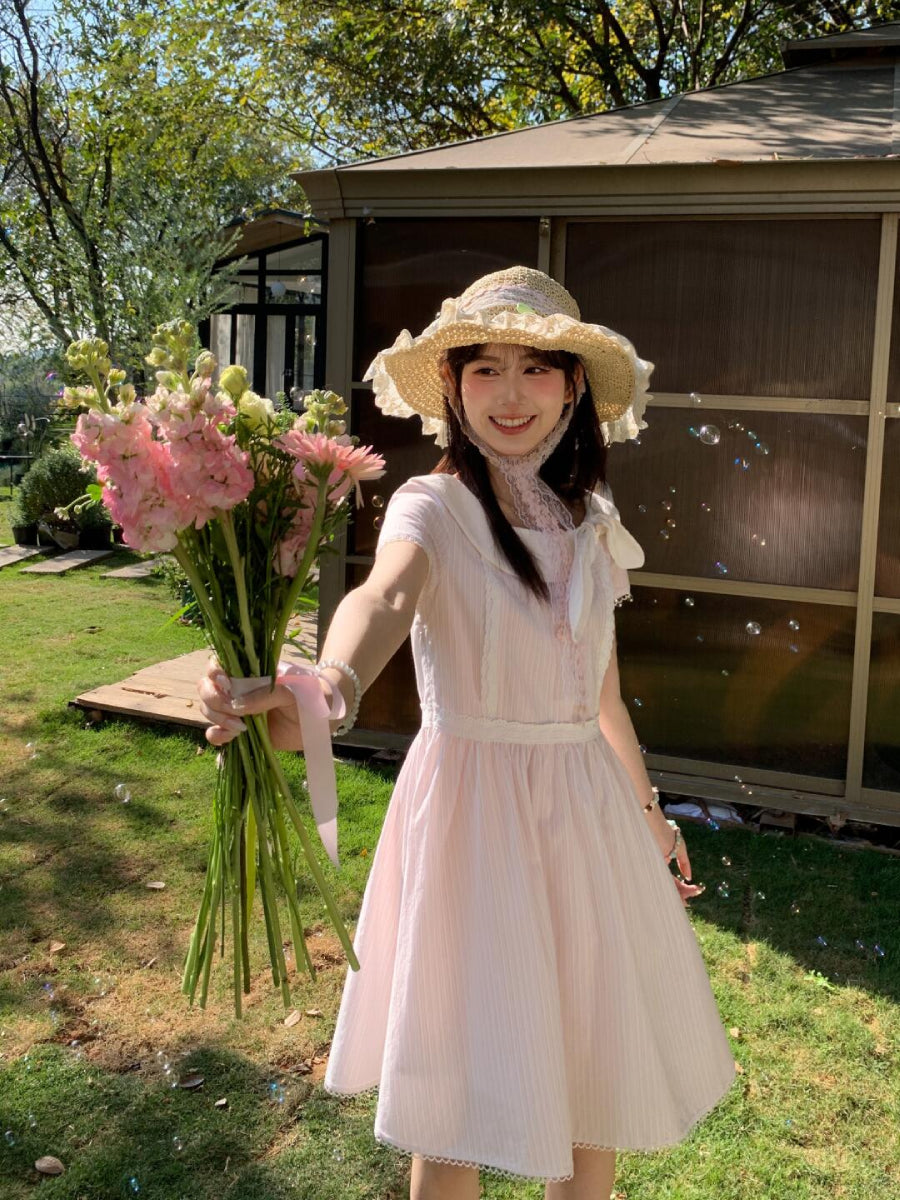 Cream cotton stripes, a broad collar bow, and a gathered skirt — the sort of dress worn while crossing a sunlit garden path. 🌿