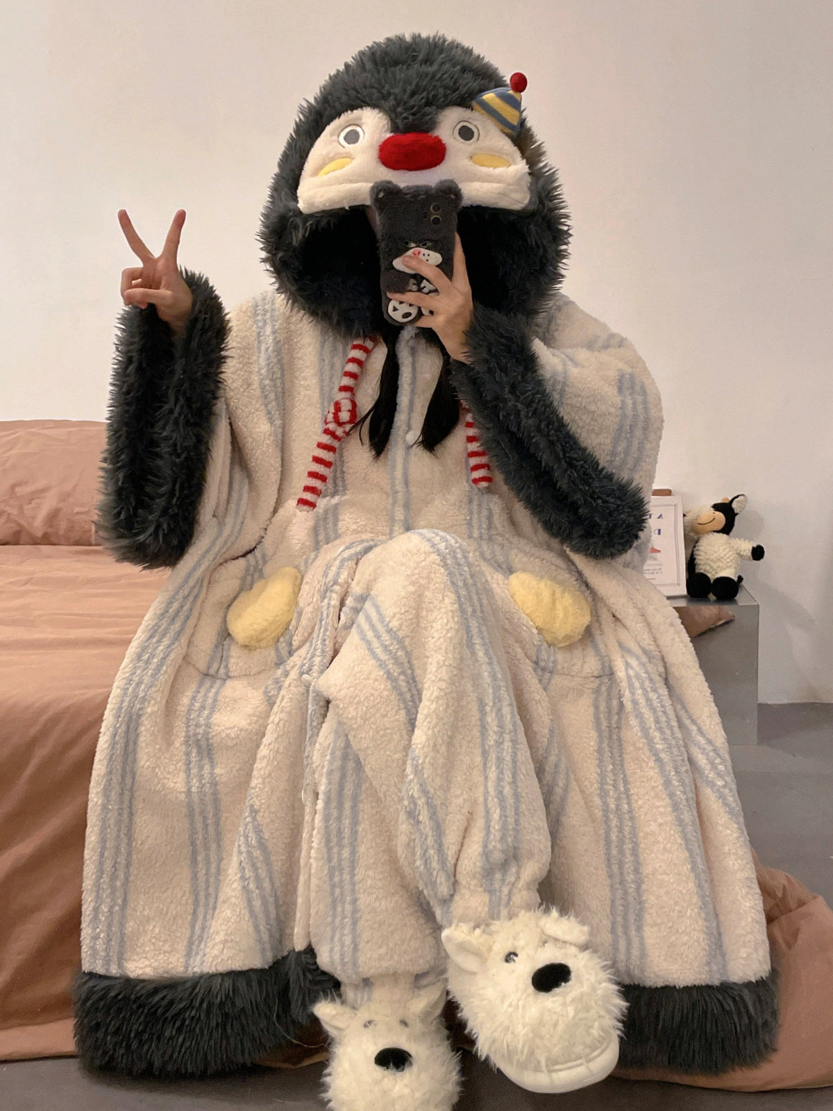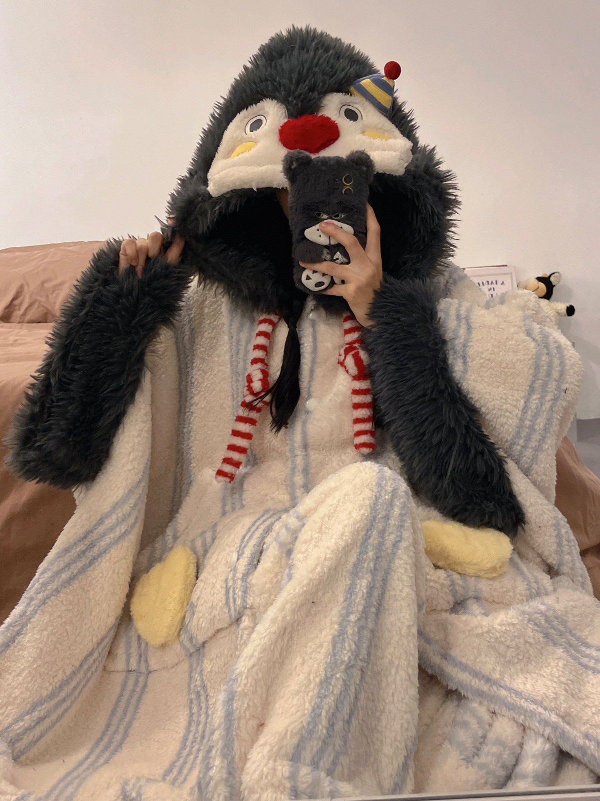 • Penguin hat hood with stitched eyes, red nose, and small party-cap detail.