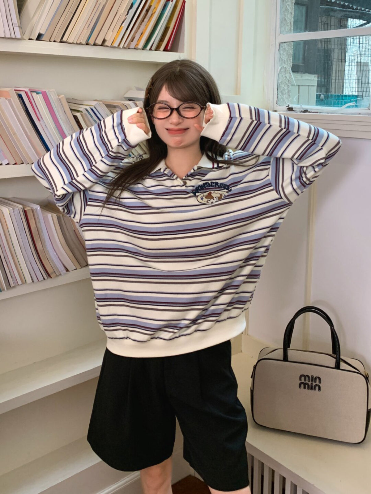 Cream stripes, a small puppy stitch, and a cotton rib edge, recalling wooden steps and borrowed library books 🐶