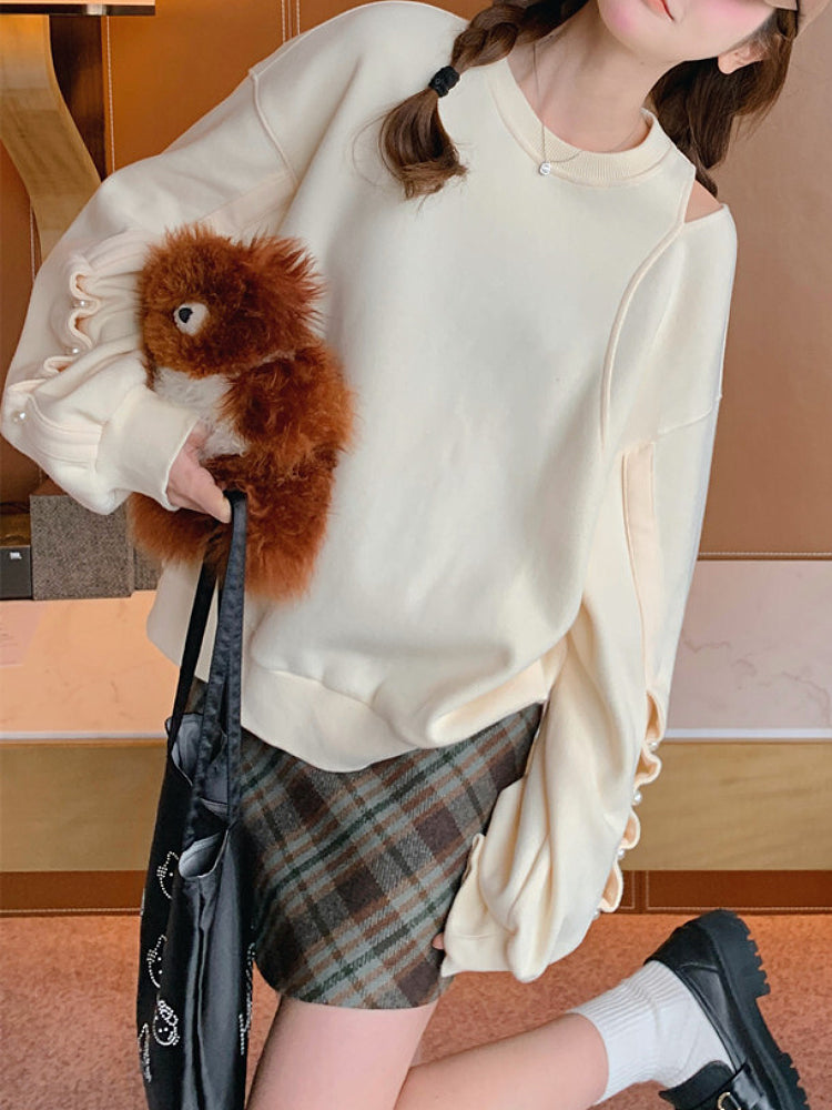 A soft ivory sweatshirt with a twist — the Pearl Mood Sweatshirt redefines casual with delicate shoulder cutouts and pearl-trimmed cuffs. Feminine, collegiate, and a little retro — it’s your perfect pick for a soft academic off-duty look.