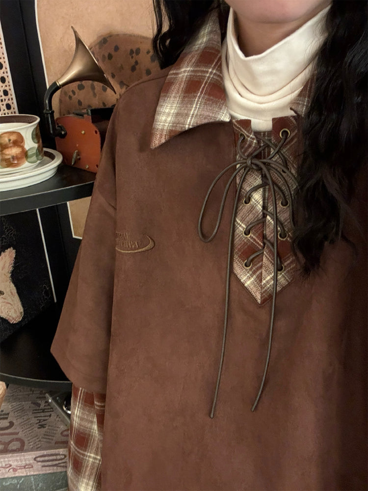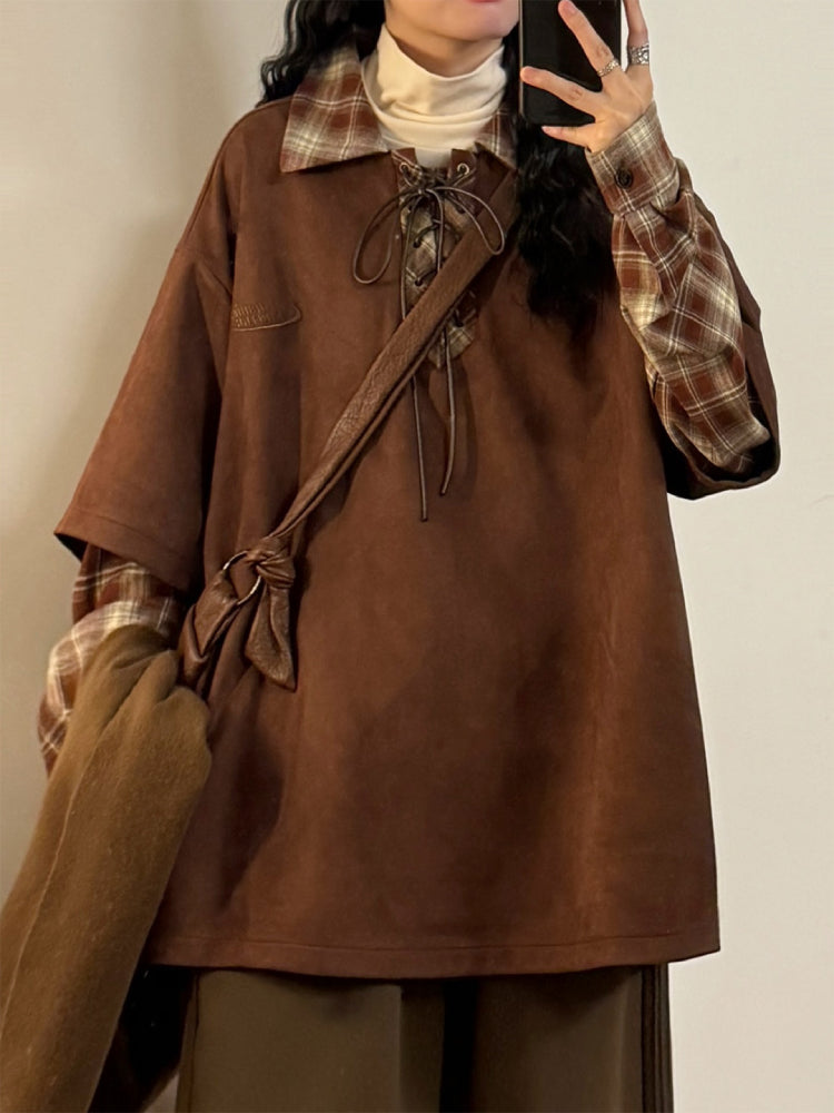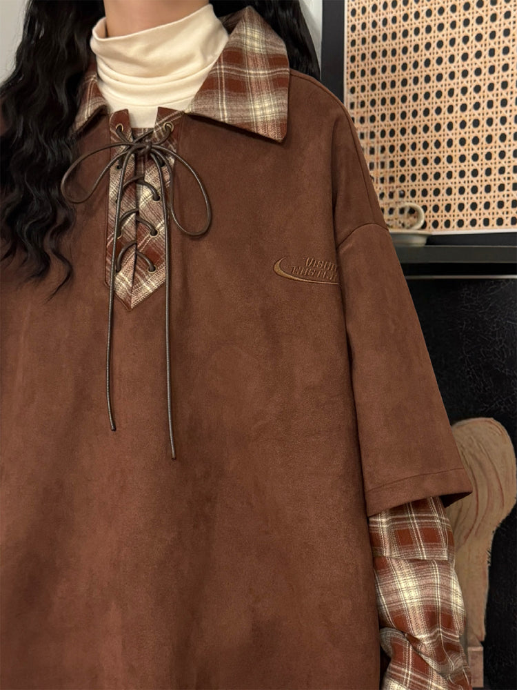 • Design: Fake two-piece style combining plaid shirt collar and lace-up detail under a suede-textured pullover