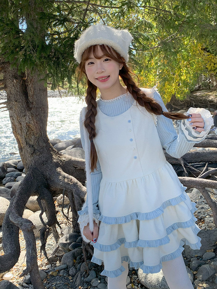 Pale blue tiers, narrow buttons, and gathered hems — the kind of outfit worn while stepping between river stones 🫧