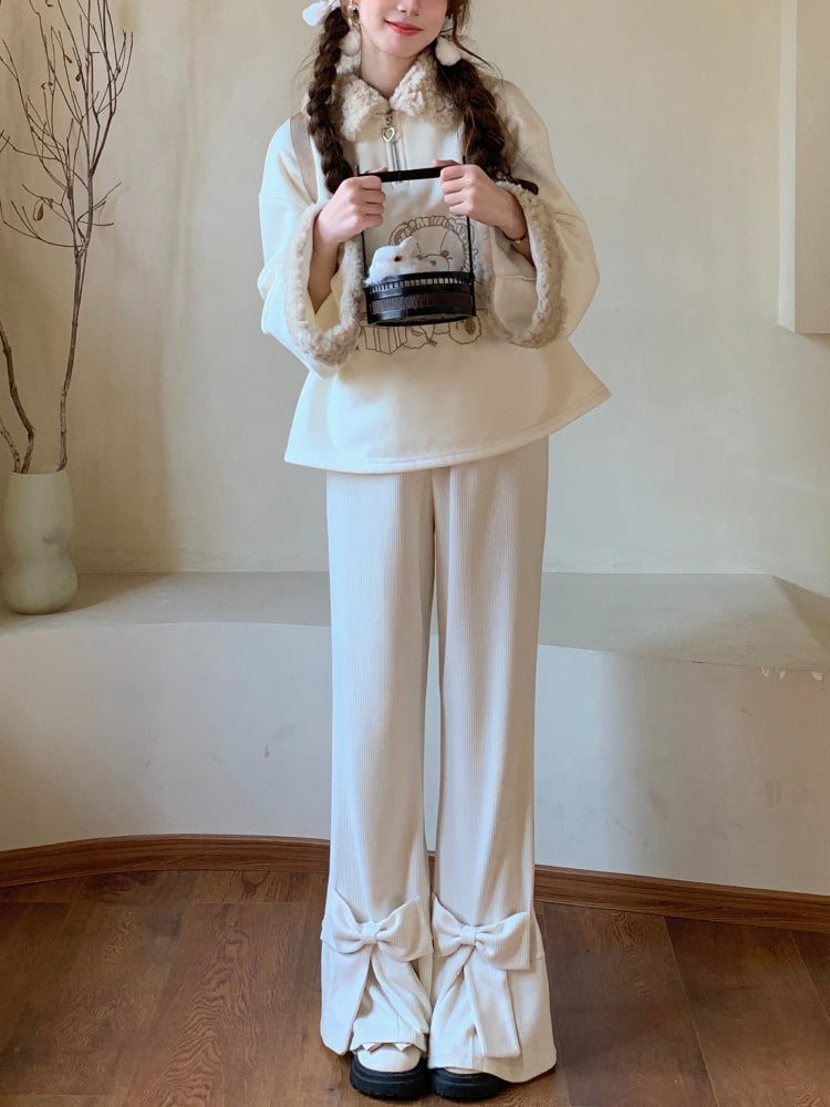 Wide-leg ribbed slacks with oversized bow accents — feminine elegance meets cozy pre-autumn chic.