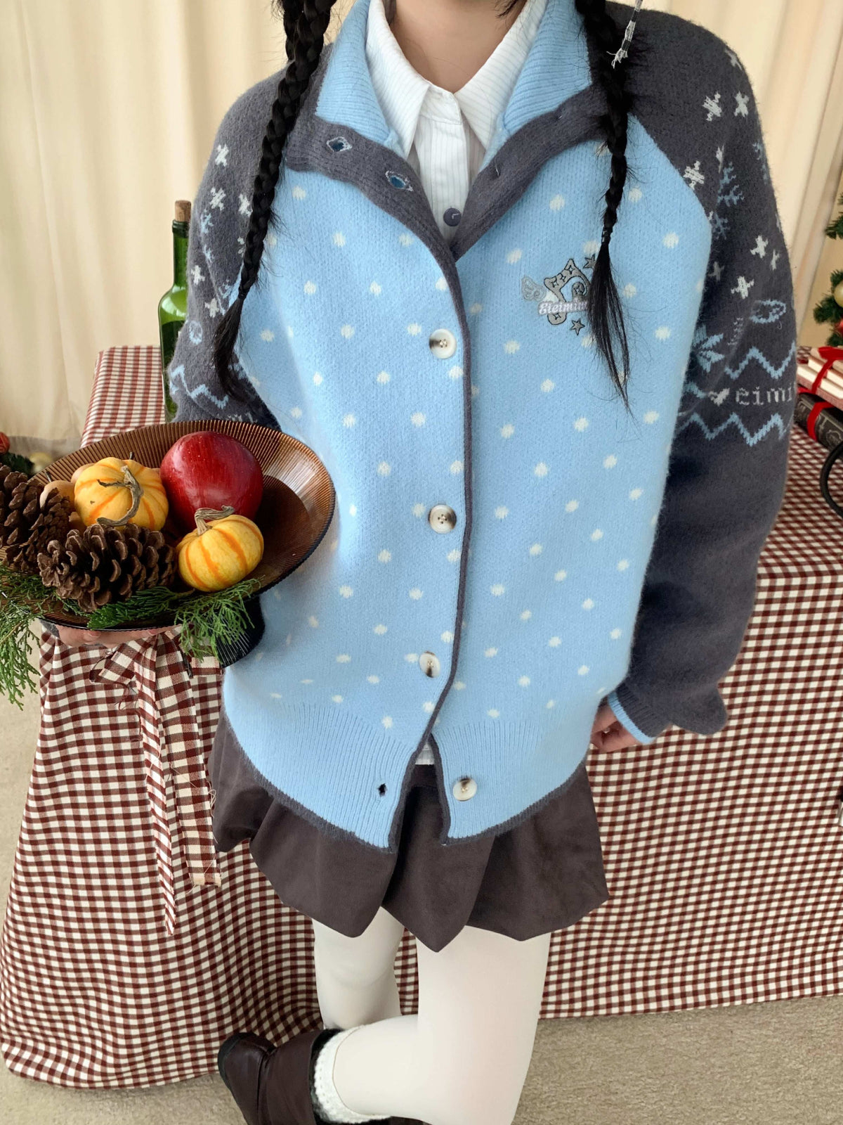 Red knit dotted with white circles and finished with simple buttons — like sitting near a window while the calendar magically flips to December. ❄️
