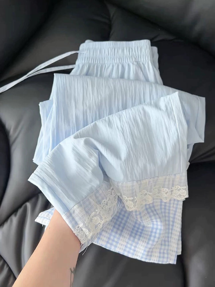 These pastel gingham bubble pants feature lace trim, a breezy wide-leg silhouette, and quick-drying fabric that keeps you cool and cute in any weather. Inspired by baby bloomers, they blend cottagecore softness with a dopamine color twist, perfect for lounging, layering, or styling with a frilly crop top.