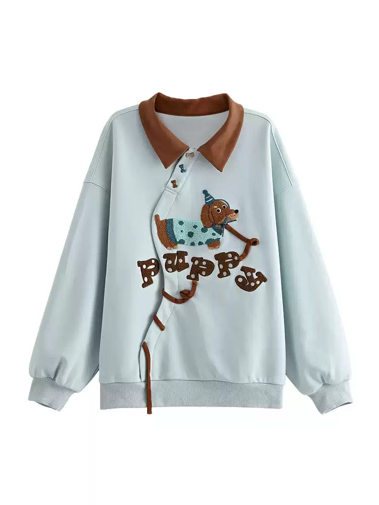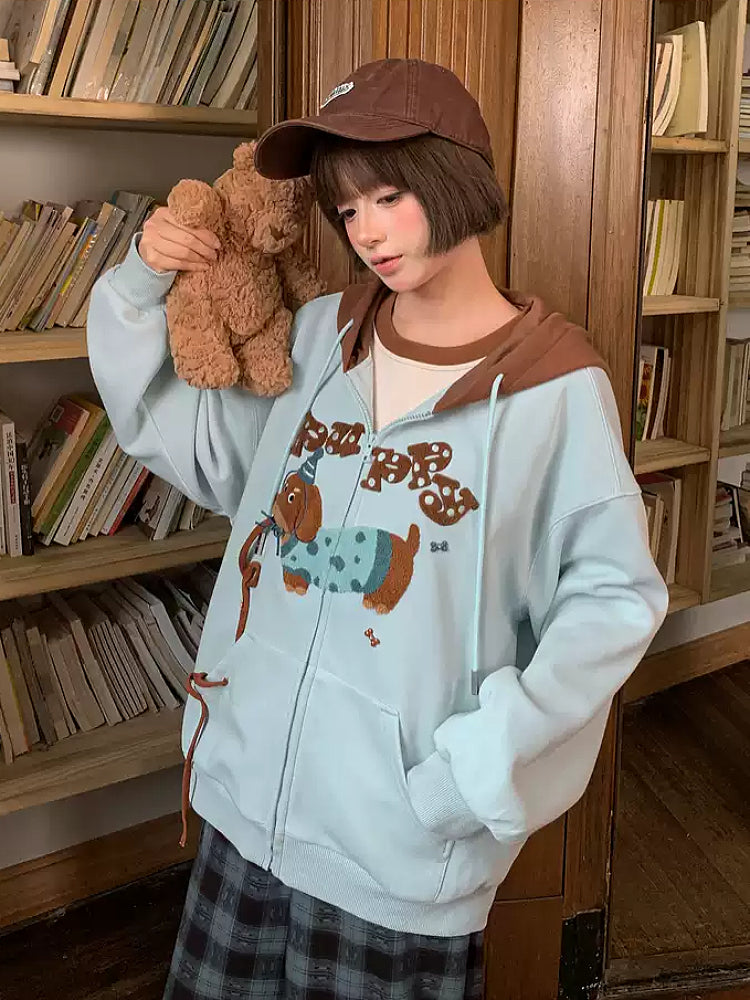 Light blue cotton, brown trim at the collar or hood, and a stitched dachshund pulling ribbon letters, hinting at shared stairwells and borrowed outerwear 🐾