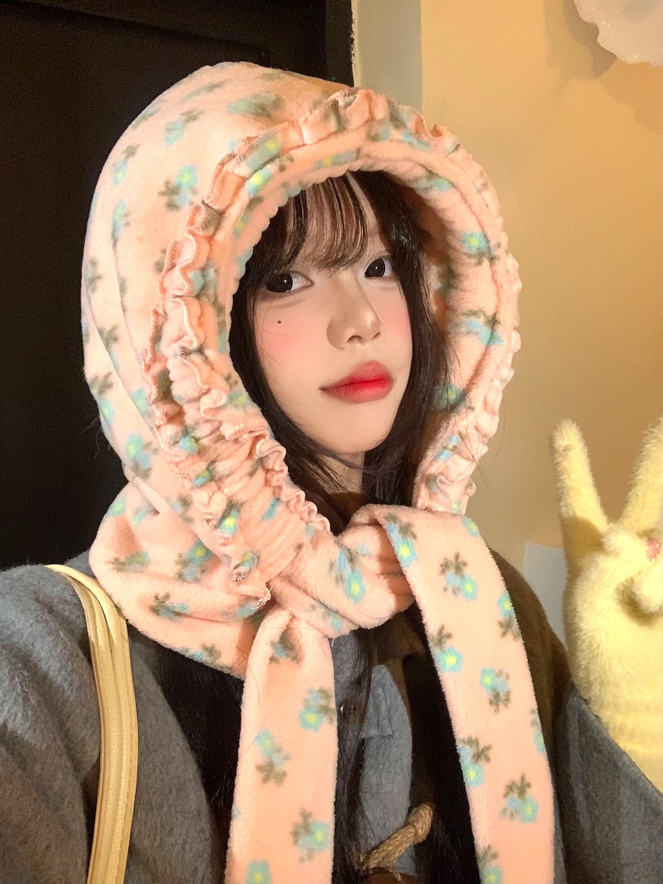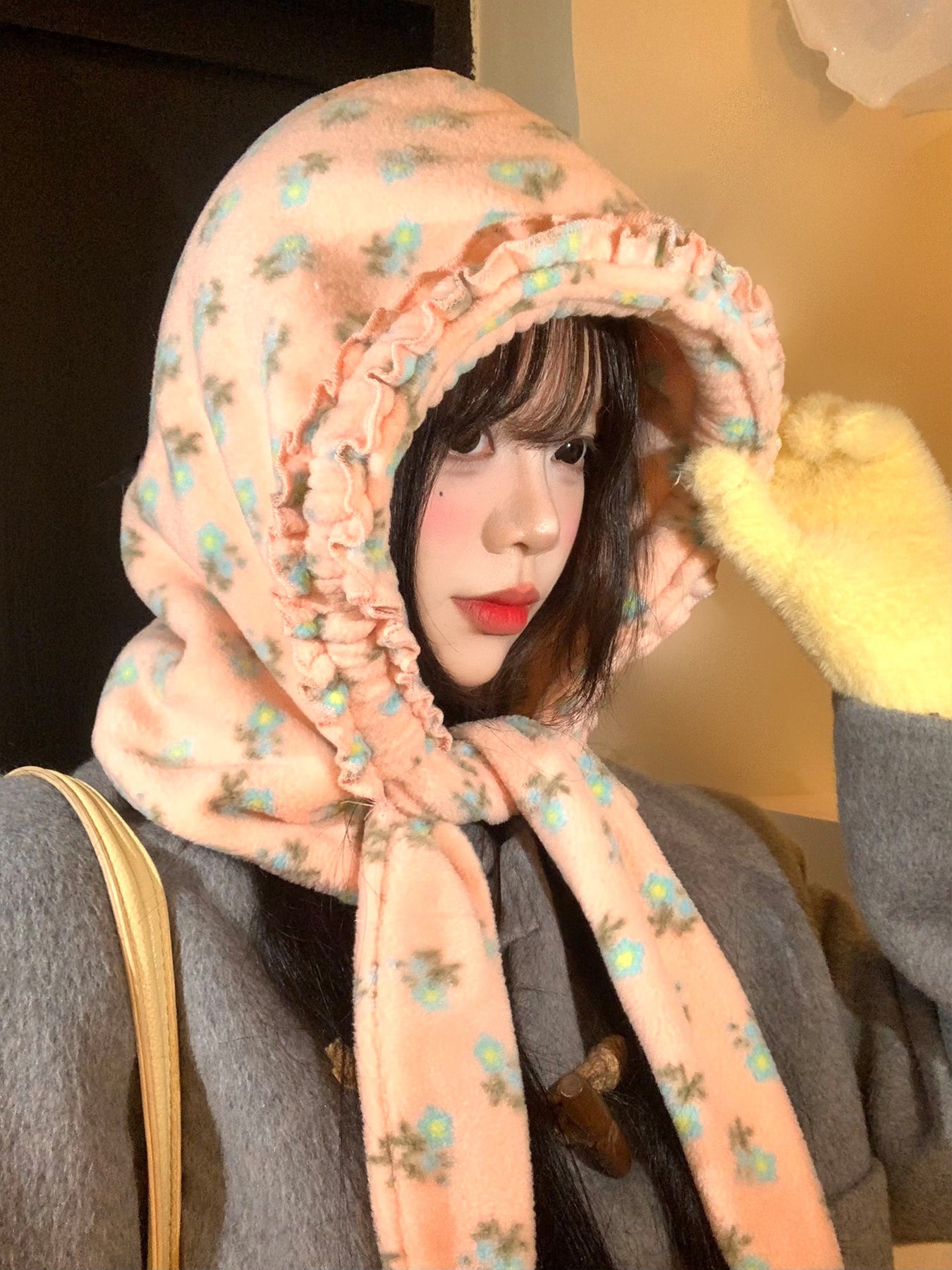 Pink plush scattered with small flowers, tied under the chin as hallway lights glow at dusk 🌸
