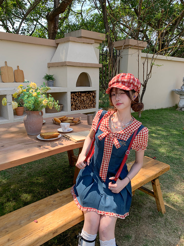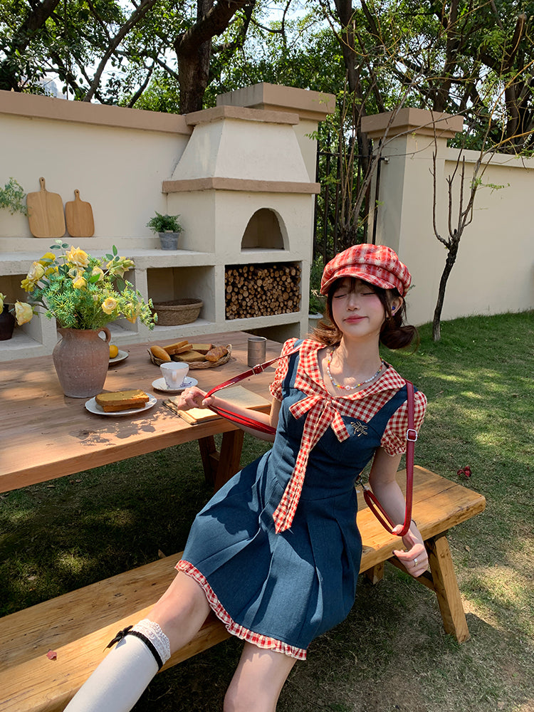 • Design: Faux two-piece illusion (denim-style top + plaid skirt)