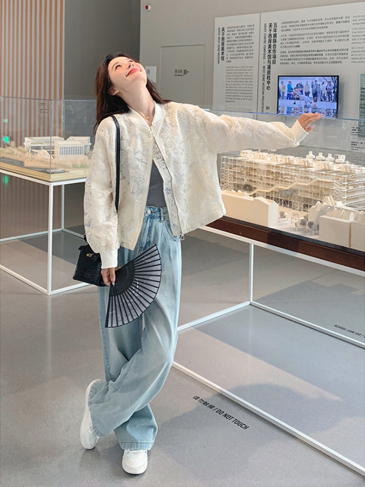 The Cloud Lace Bomber reimagines a classic jacket with dreamy French femininity. Soft floral lace overlays a relaxed silhouette, creating a balance of sweetness and cool — perfect for layering through breezy spring or autumn days.