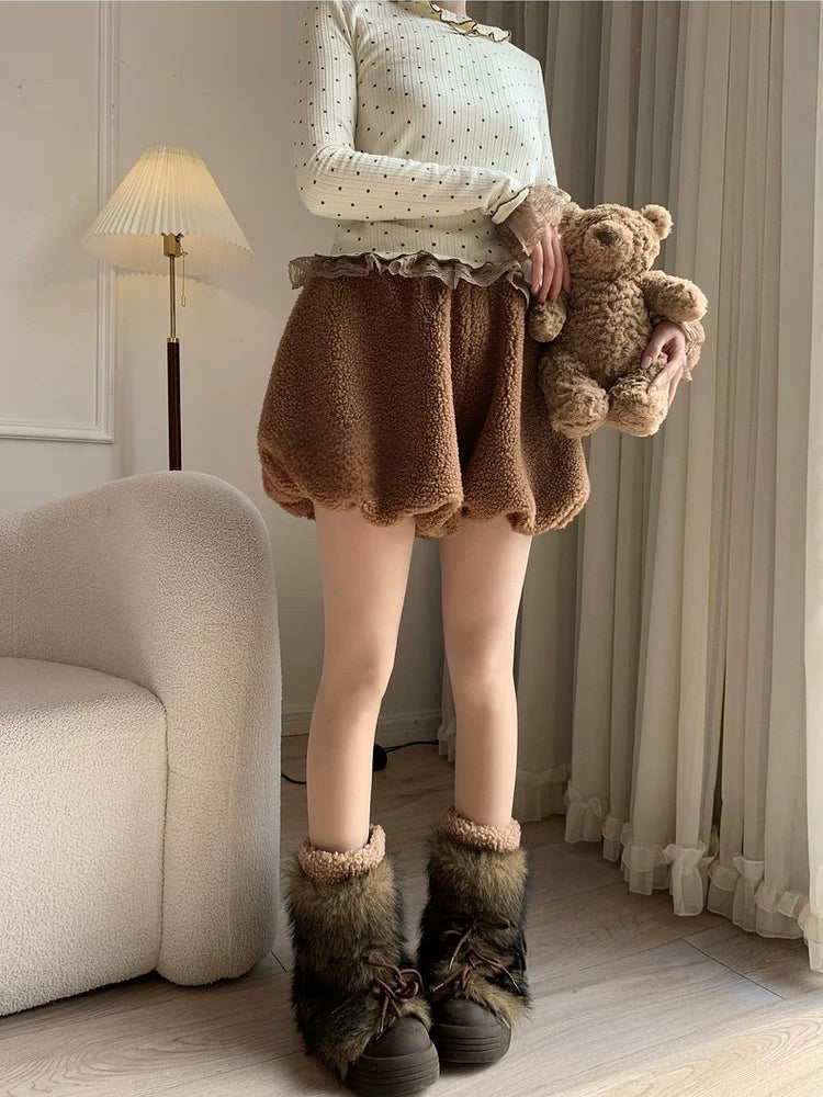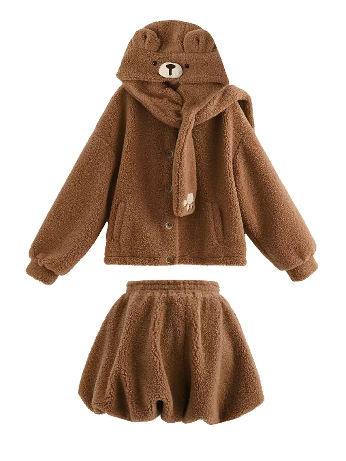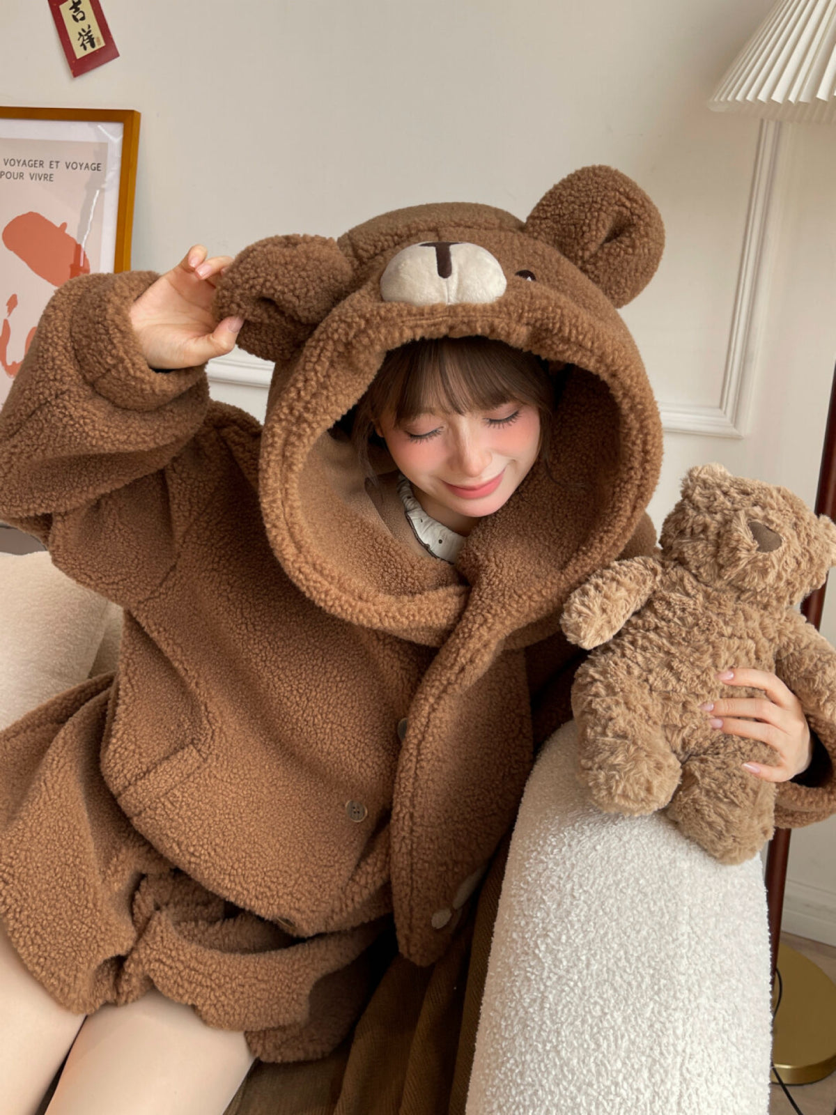 Brown fleece, rounded bear ears on the hood, and bubble shorts pooling slightly at the hem, hinting at late nights under desk lamps 🧸