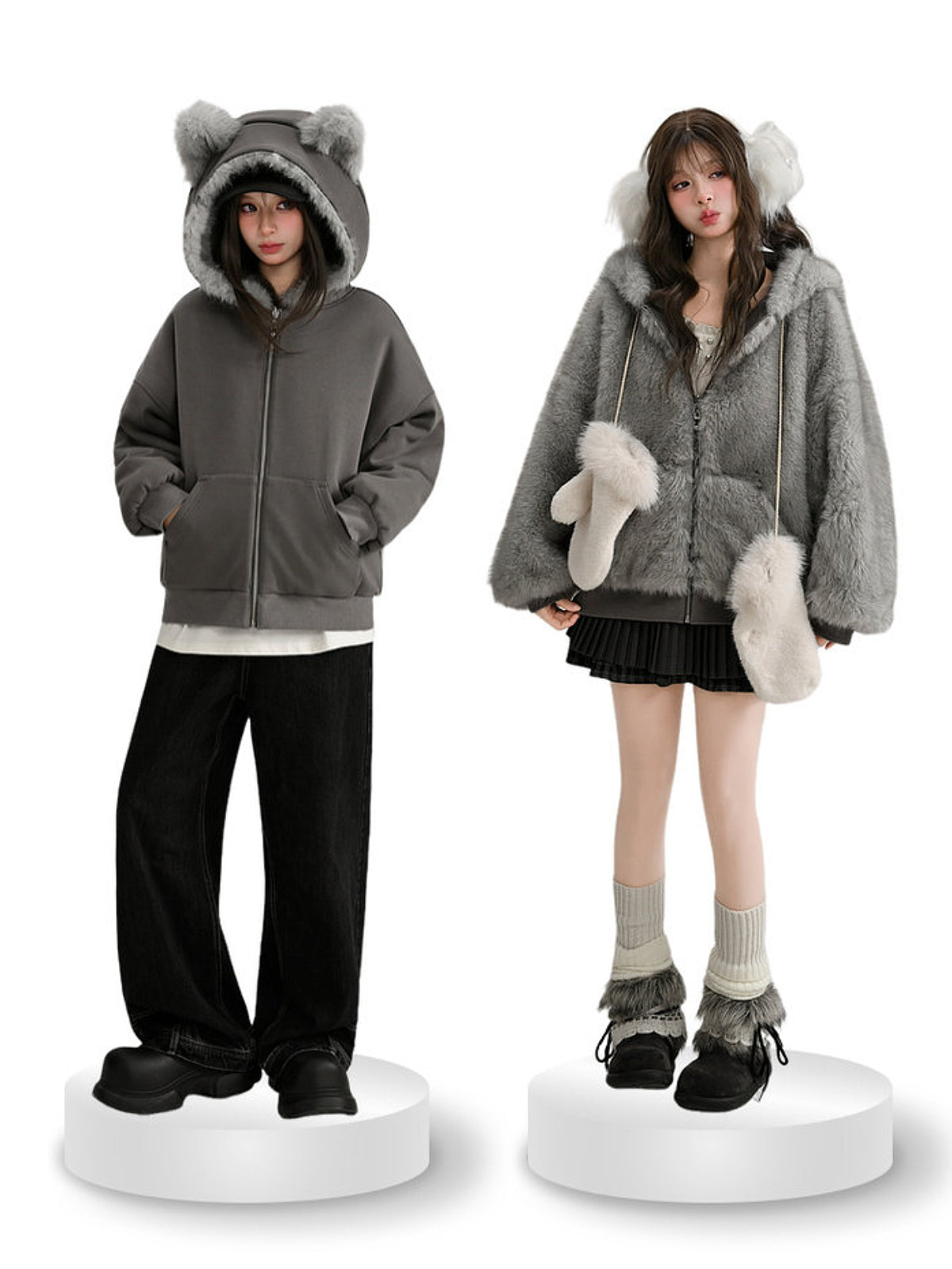 A reversible hooded jacket with character ears and two distinct surface finishes.