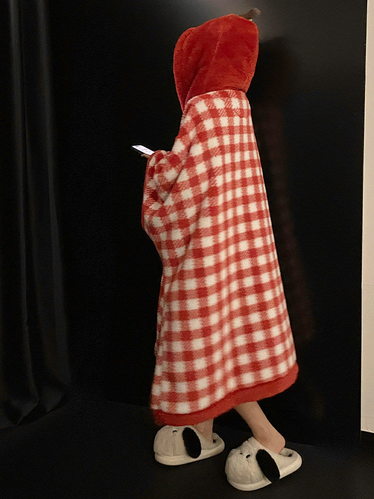 Red flannel, apple pockets, and a hood tied once — the hour after dinner, before the lights go low 🍎