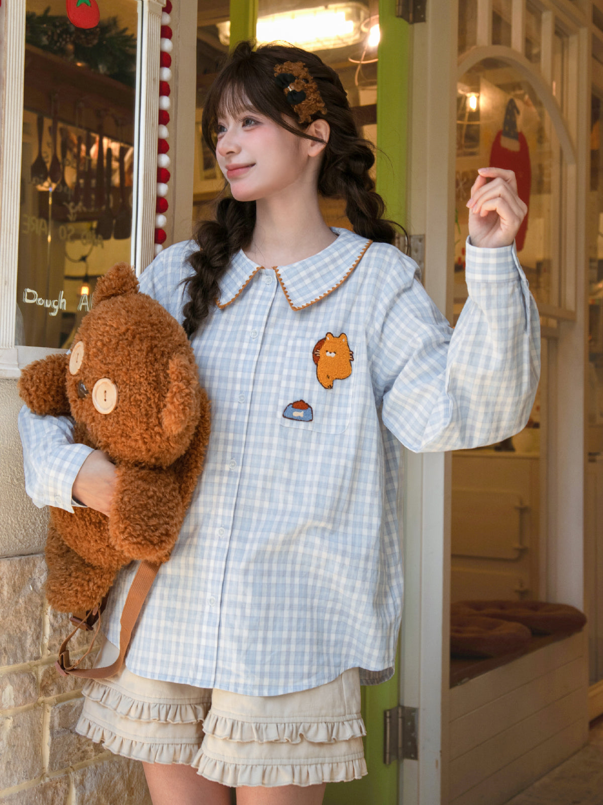 Cat Snack Plaid Collar Shirt-Tops-ntbhshop