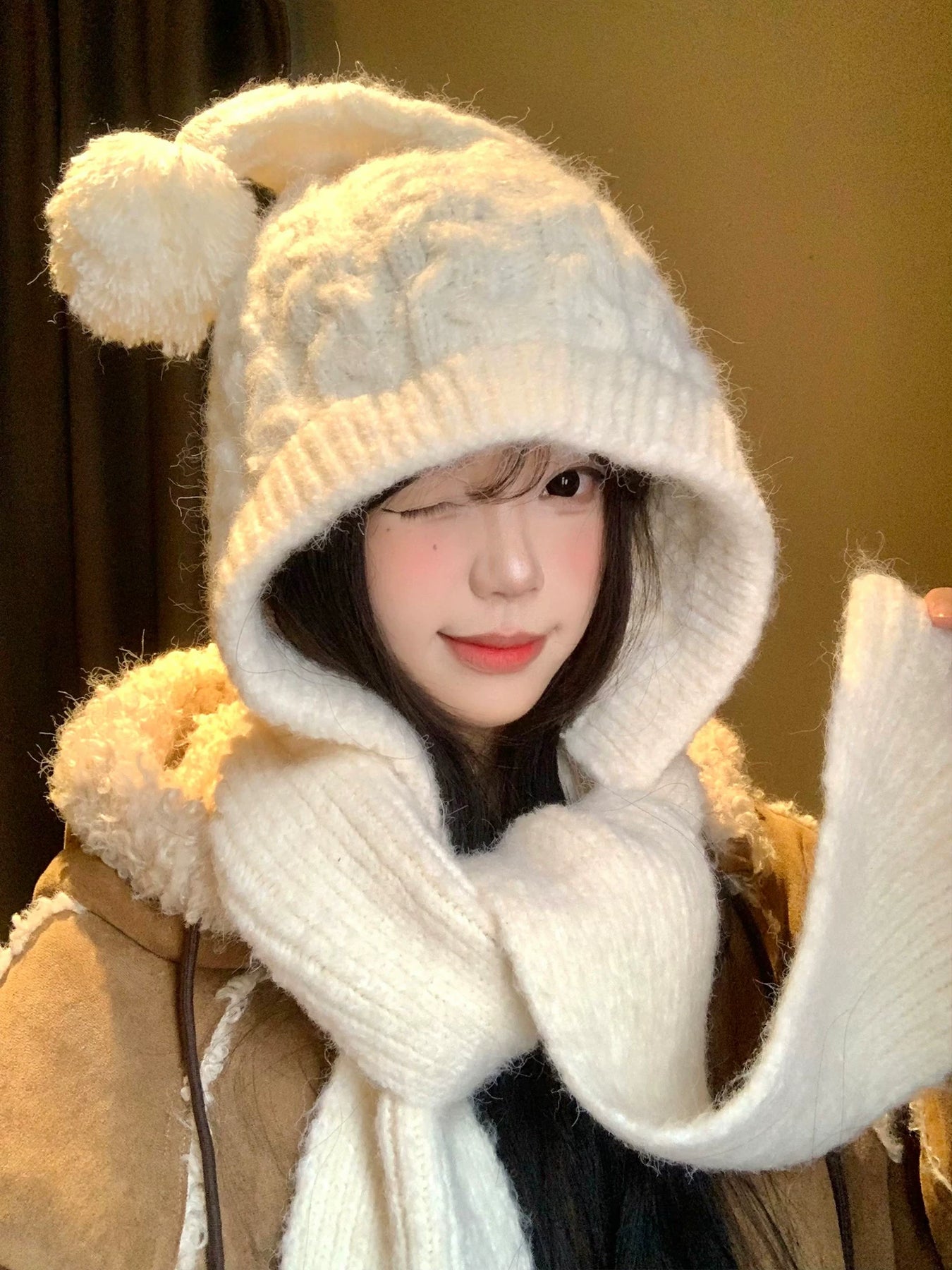 Ivory wool knit with a single pom at the top, wrapped close under evening lamp light ❄️