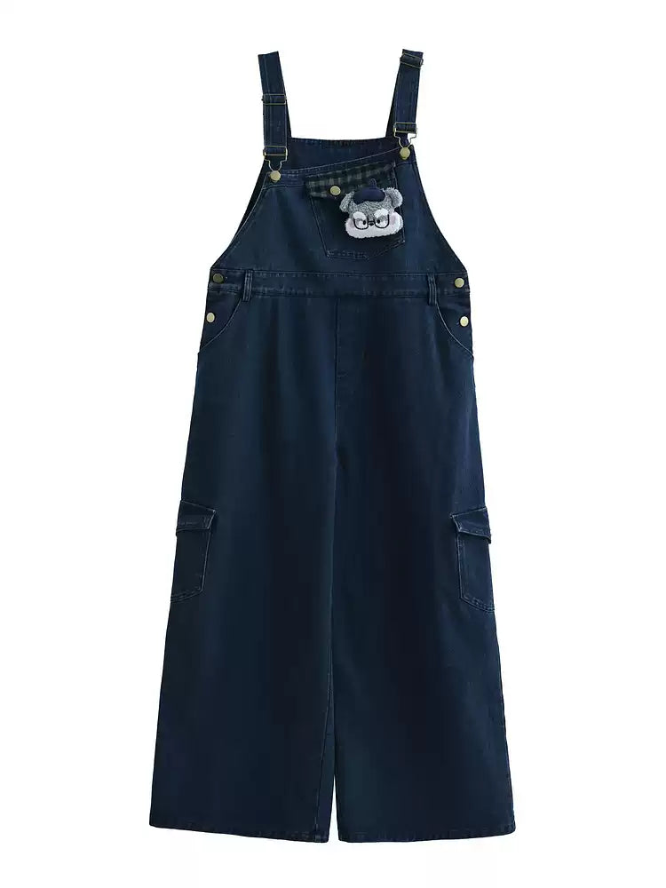 A wide-leg denim bib with a loose cut and a small stitched detail.