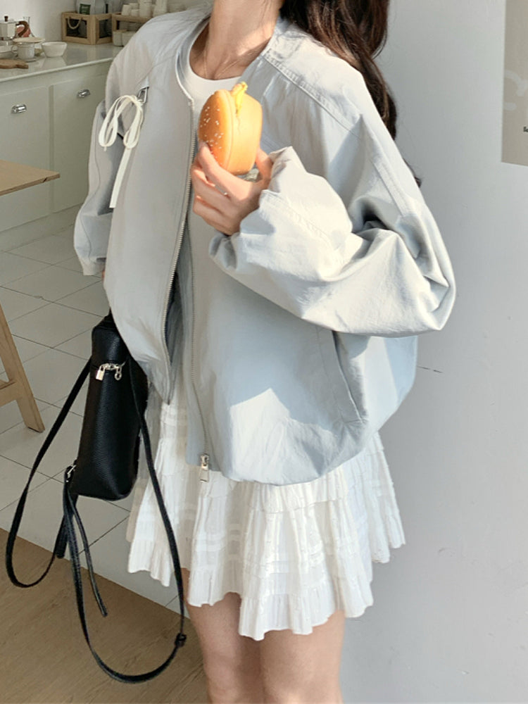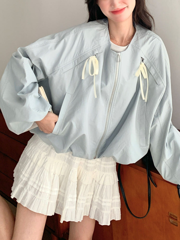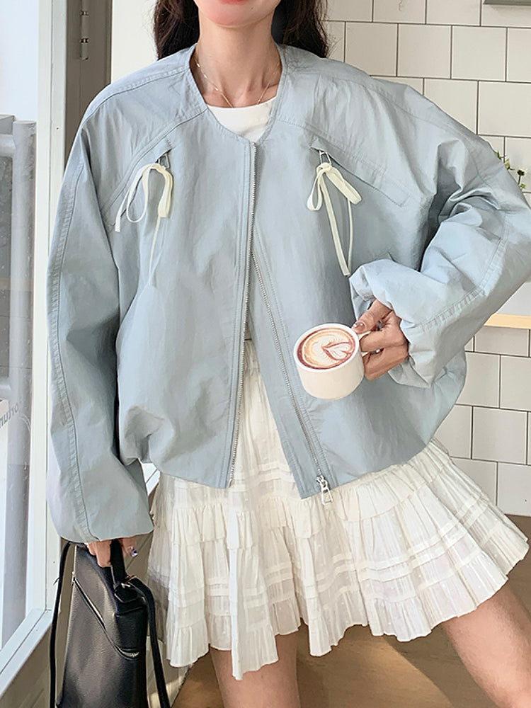 Soft, fluttery, and full of charm — a baby-blue cropped jacket with bow lace-ups that bring instant spring sweetness.
