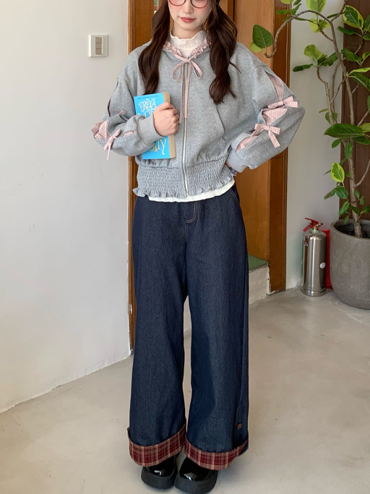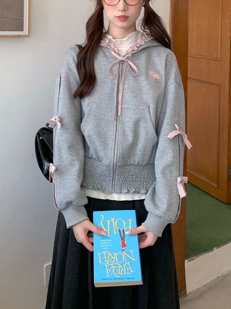A sweet and cozy hoodie that blends preppy charm with soft-girl details — finished with plaid ribbons, ruffle trims, and gentle cartoon embroidery. Perfect for campus walks or journaling afternoons.