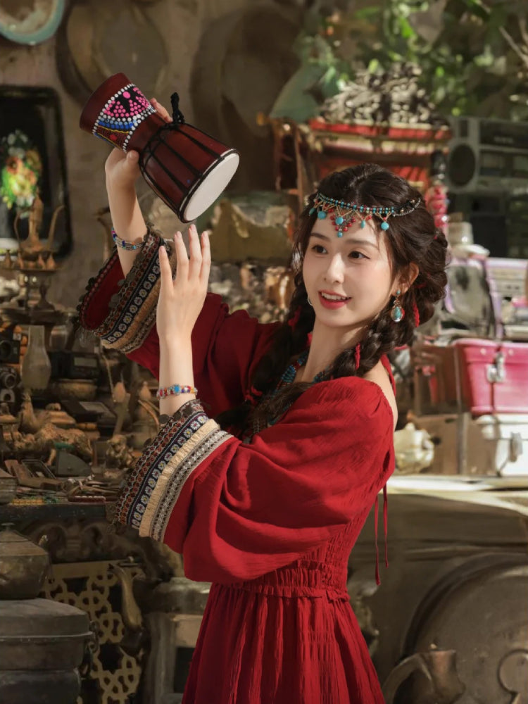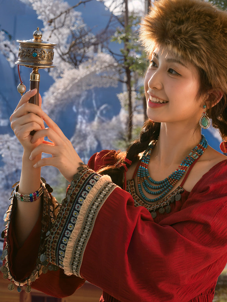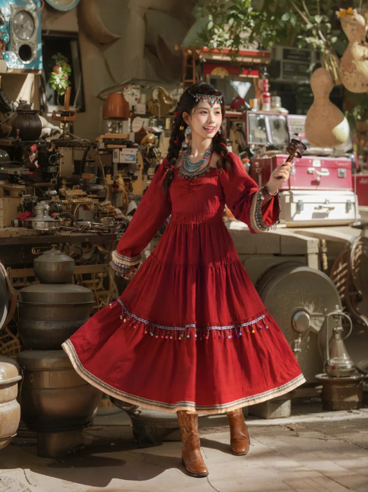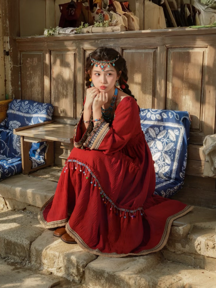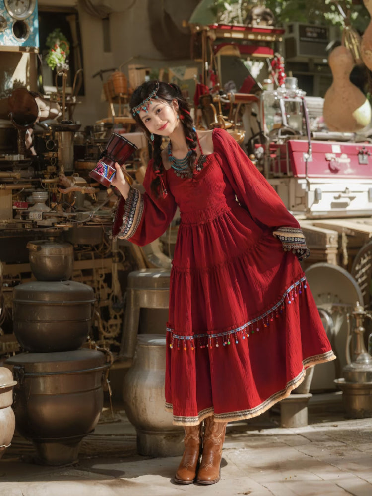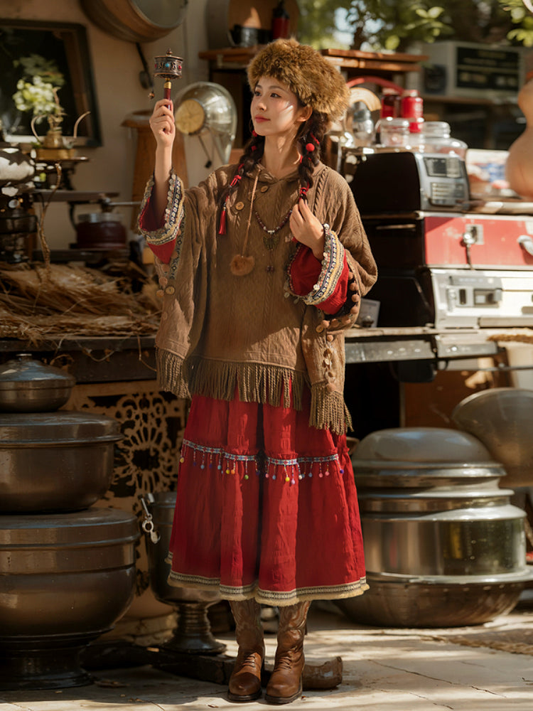 • Design: Ethnic woven trims, tassel embellishments, billowing sleeves