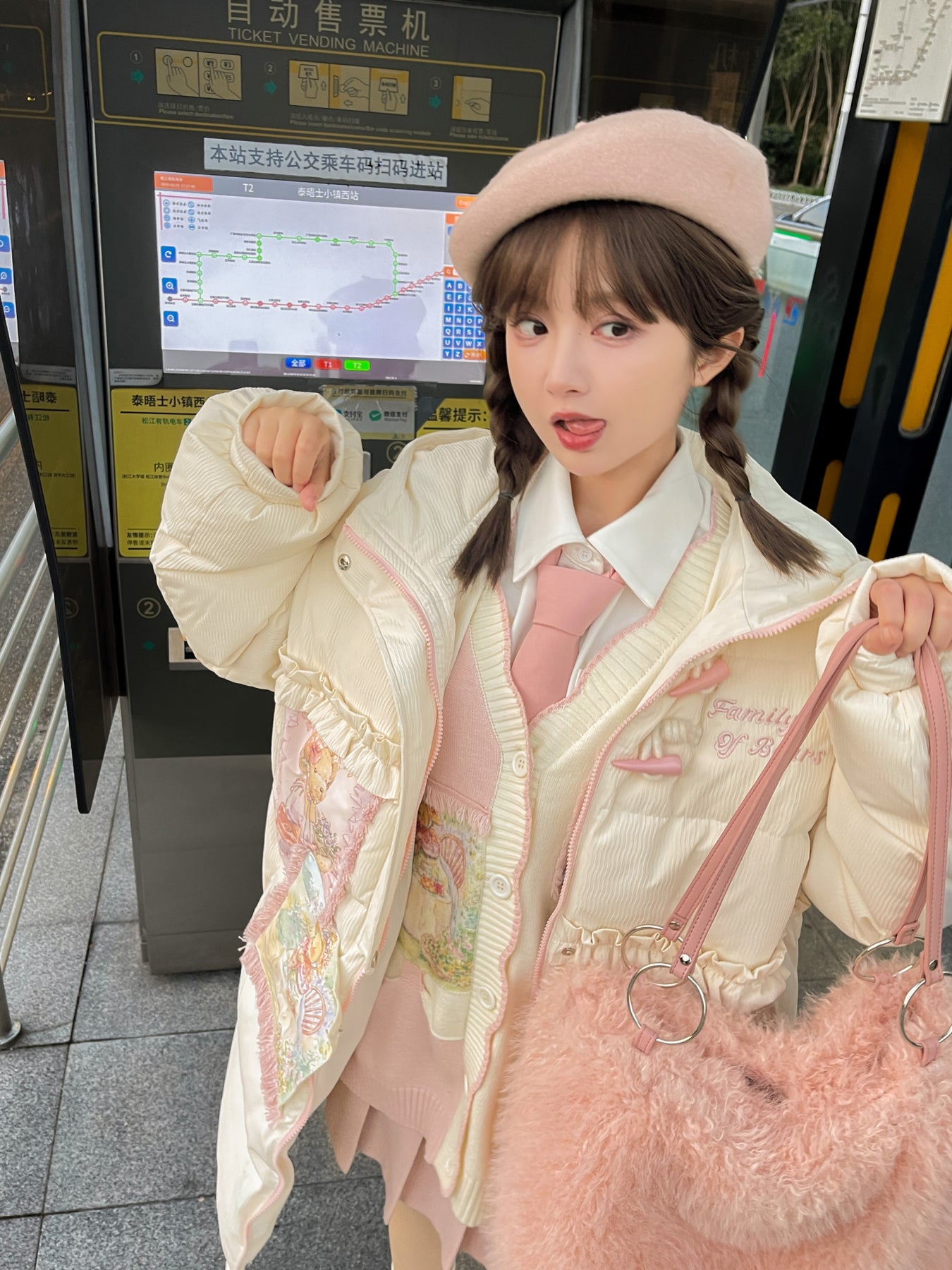 A tender winter tale woven into a coat — this mid-length puffer is as warm as a family hug. The bear design brings a soft, nostalgic calm, while the plush silhouette and muted tones feel like freshly baked bread on a quiet morning.
