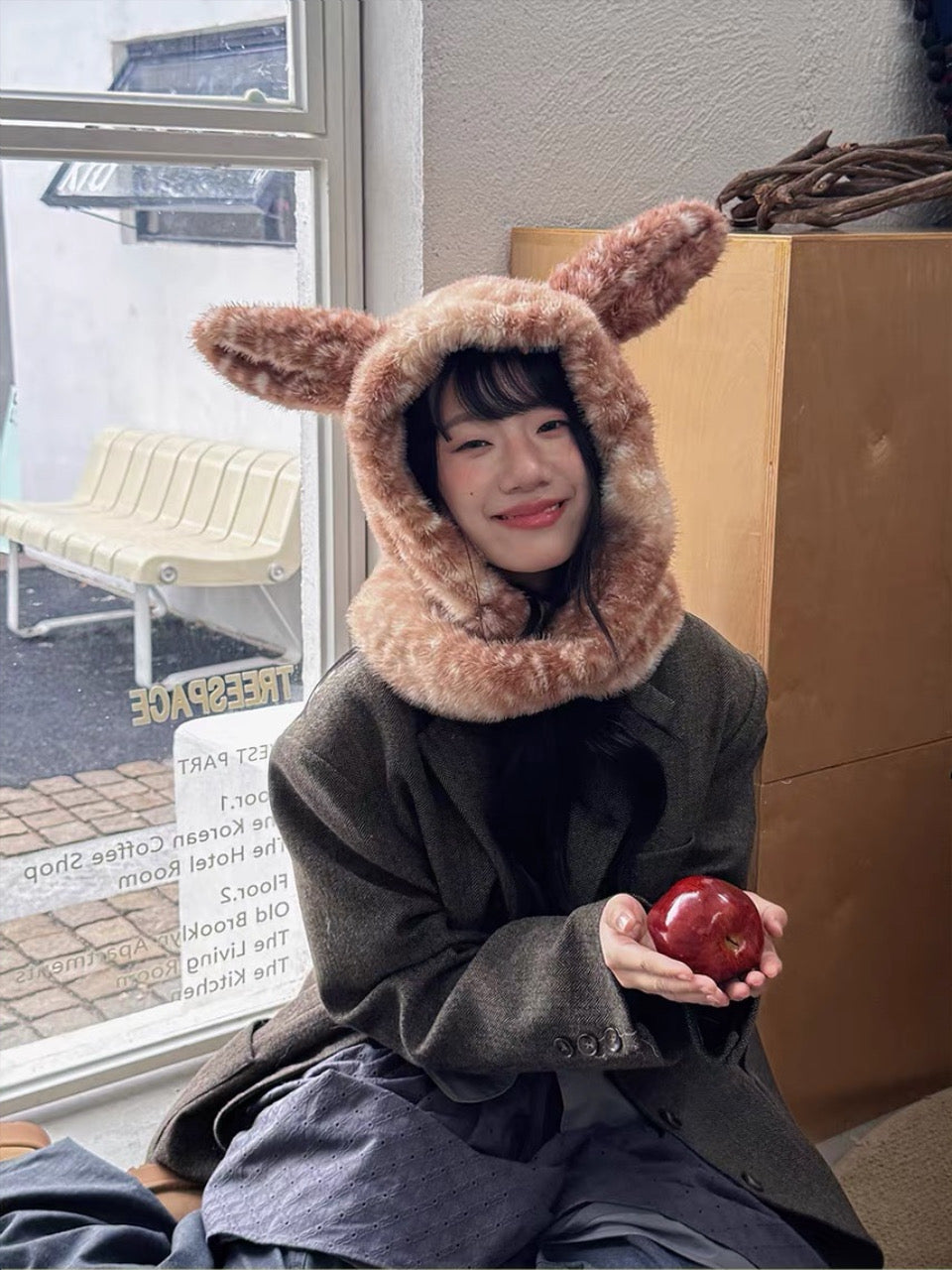A whimsical all-in-one plush fawn hood and scarf that wraps you in woodland warmth — ultra-soft, cuddly, and irresistibly cute for sweet-girl winter outfits.