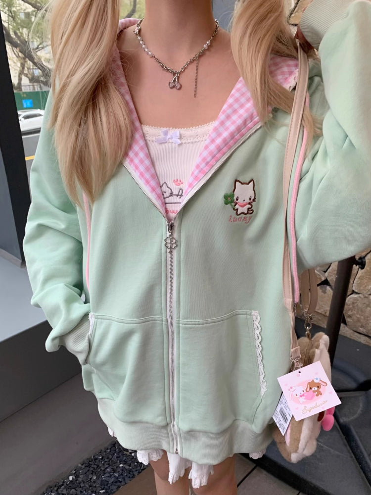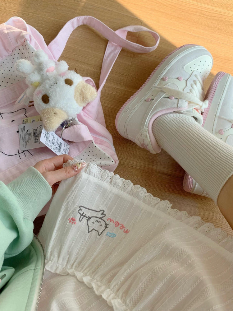 Meow Love Fish Tutu Skirt — A dreamy white cotton short skirt layered with soft lace and delicate cat embroidery. Light, twirly, and full of shoujo-girl magic, it’s the perfect mix of kawaii and fairytale charm.
