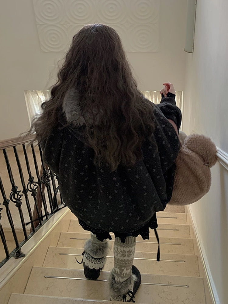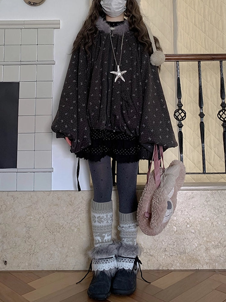 Wrap yourself in a starlit winter story — this soft fleece cape brings cozy fairytale charm to chilly days. With balloon bat sleeves, subtle polka dots, and a fluffy bow hood, it’s the perfect piece for dreamy girls who love a hint of mystery in their warmth ❄️🖤