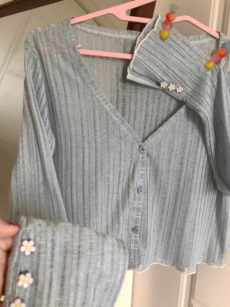 A dreamy summer cardigan with delicate flower buttons and a breezy cropped fit. Lightweight yet stylish, it’s your go-to layering piece for sunny days and cool evenings.