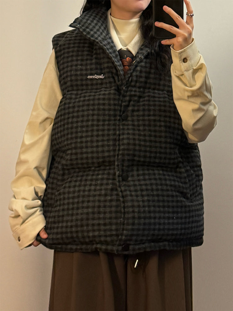 A warm and nostalgic vintage-style plaid puffer vest with a soft stand collar — thick, cozy, and perfect for layering through crisp winter days.