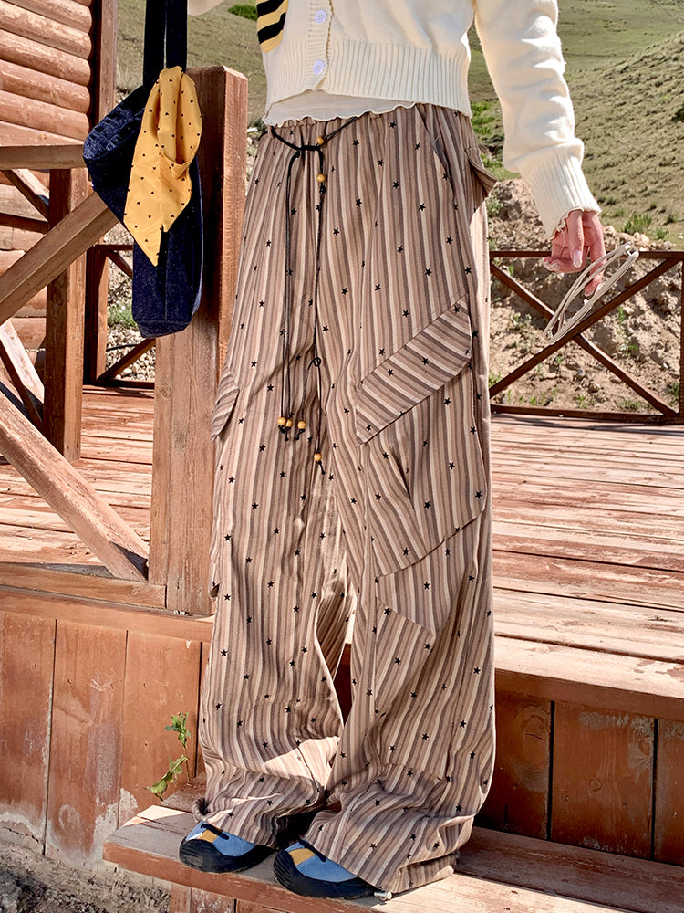 • Design: Loose straight-leg cargo pants with all-over mini star print and natural stripe texture