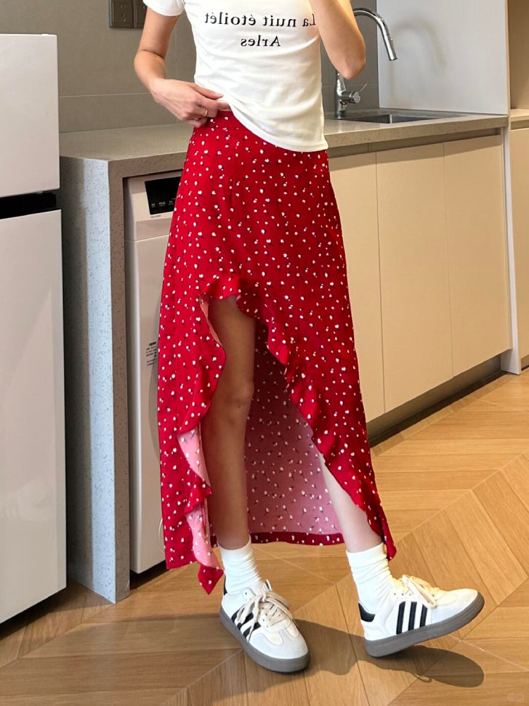 This high-waisted red floral long skirt features an irregular ruffle hem, a soft side slit, and a fishtail silhouette that hugs and flares in all the right places. Designed for chubby mm and plus-size beauties, it blends romance with ease for daily wear, dates, or warm-weather getaways.
