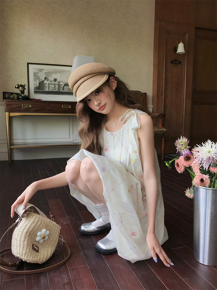The Lolan Garden Sleeveless Bubble Dress captures the sweetness of summer with its airy floral print, age-reducing bow details, and sleeveless bubble silhouette. Designed in a soft poly–tencel blend, this midi dress blends niche elegance with playful charm. 🌼💫