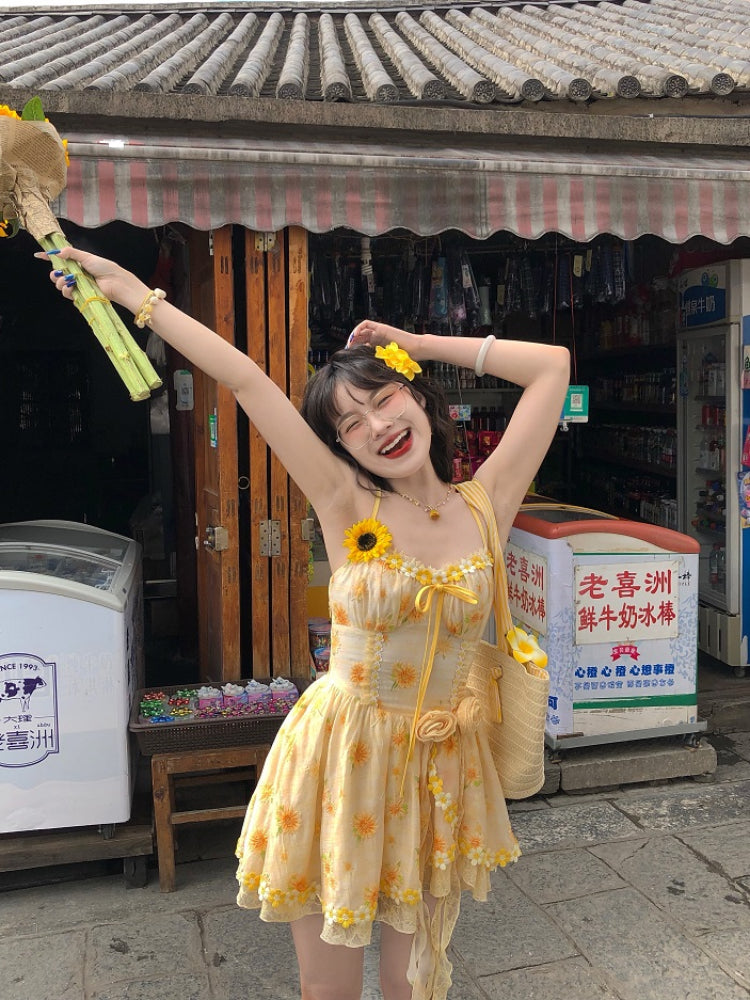 Sunflower Lace-Up Back Summer Dress-ntbhshop