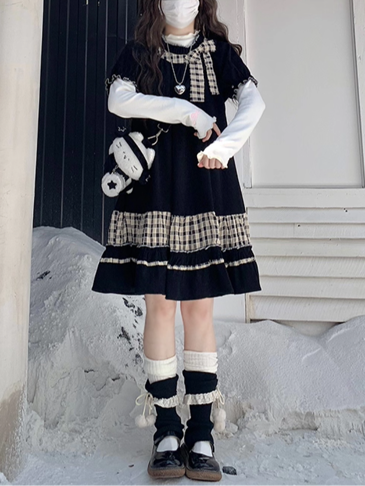 • Design: Gingham patchwork tiers, frill edges, bow accents, and a playful puff sleeve cut