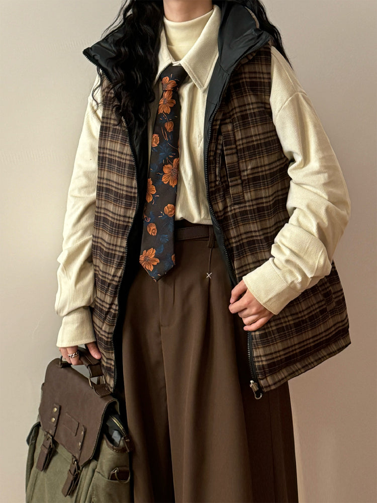 A cozy reversible retro vest that shifts from classic black to warm plaid in seconds — thick, soft, and perfect for timeless winter layering.